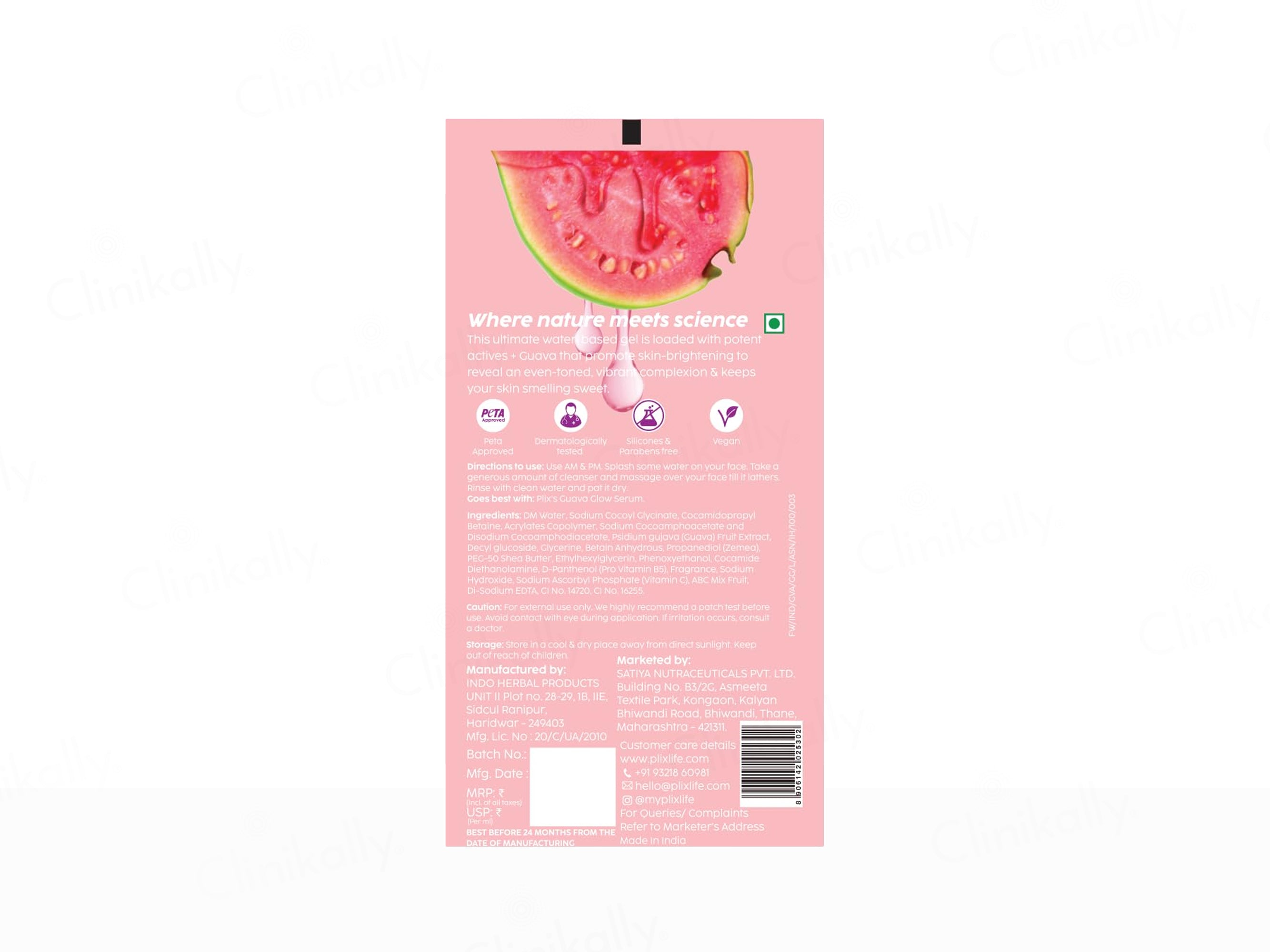 Plix Guava Glow Juicy Cleanser contains key ingredients including Vitamin C, Alpha Lipoic Acid, Pro-Vitamin B5, and Guava Extract to improve glow and hydration.