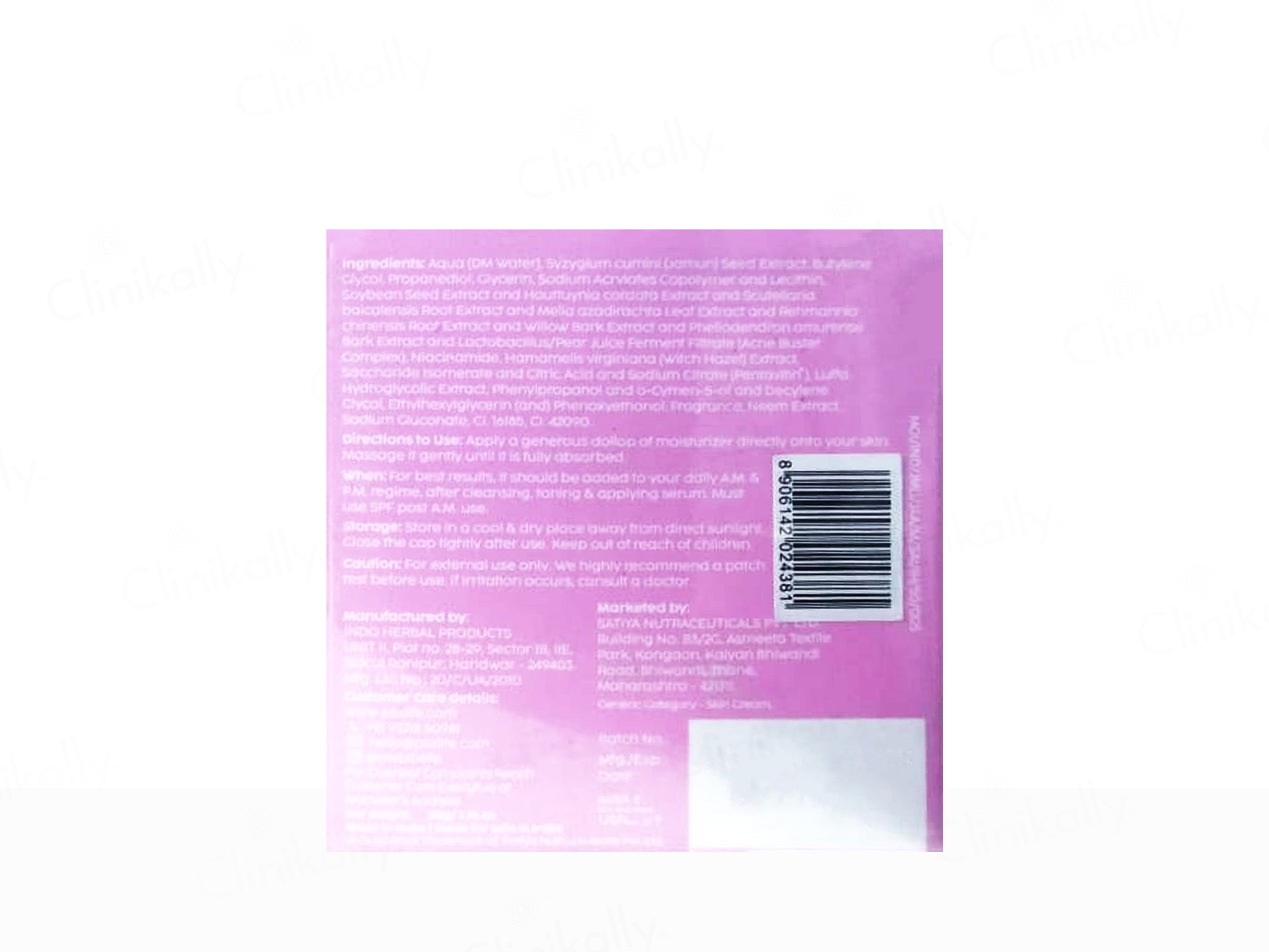 Plix Jamun Active Acne Smoothie Moisturizer is a lightweight, acne-focused daily moisturizer designed for acne-prone skin to help reduce active breakouts while maintaining balanced hydration, formulated with a targeted blend of plant extracts and proven actives that soothe skin and control excess oil. Powered by Jamun Seed Extract known for its anti-acne properties, this smoothie-textured moisturizer is enriched with Salicylic Acid to help unclog pores, Niacinamide to calm inflammation and improve skin texture, Zinc PCA to regulate sebum, and Sodium Hyaluronate to maintain essential moisture without greasiness. The formula further includes soothing botanical extracts such as Witch Hazel Extract for pore tightening, Liquorice Root Extract for calming irritated skin, Willow Bark Extract for gentle exfoliation, and Aloe Vera Juice Ferment Filtrate to comfort stressed, acne-prone skin, making it suitable for daily use. Designed to help reduce and soothe active acne while supporting oil control, Plix Jamun Active Acne Smoothie Moisturizer absorbs quickly and works effectively as part of a consistent skincare routine for clearer-looking skin.