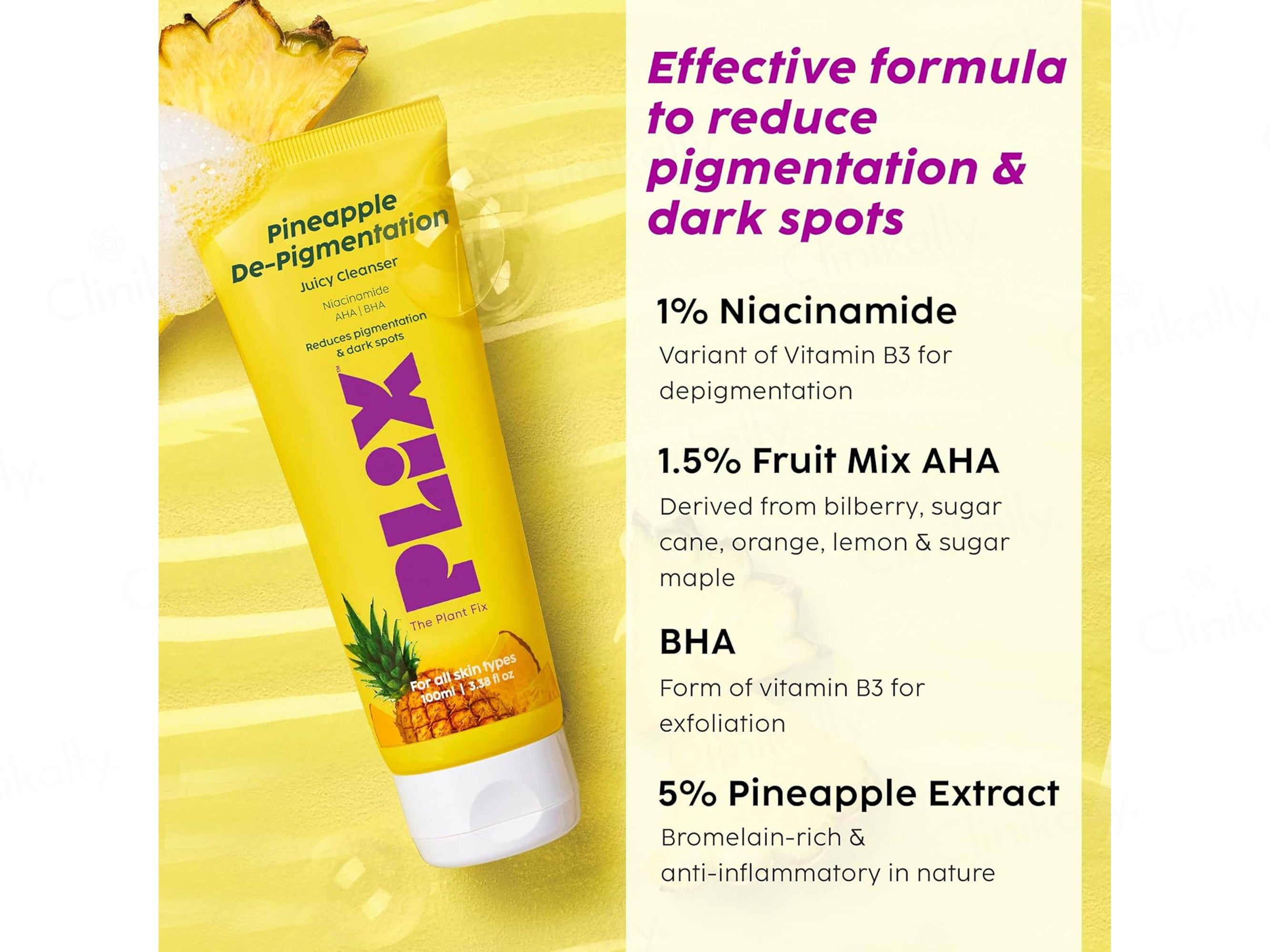 - Apply a pea-sized amount of Plix Pineapple De-Pigmentation Juicy Cleanser on damp skin, massage gently, and rinse thoroughly.