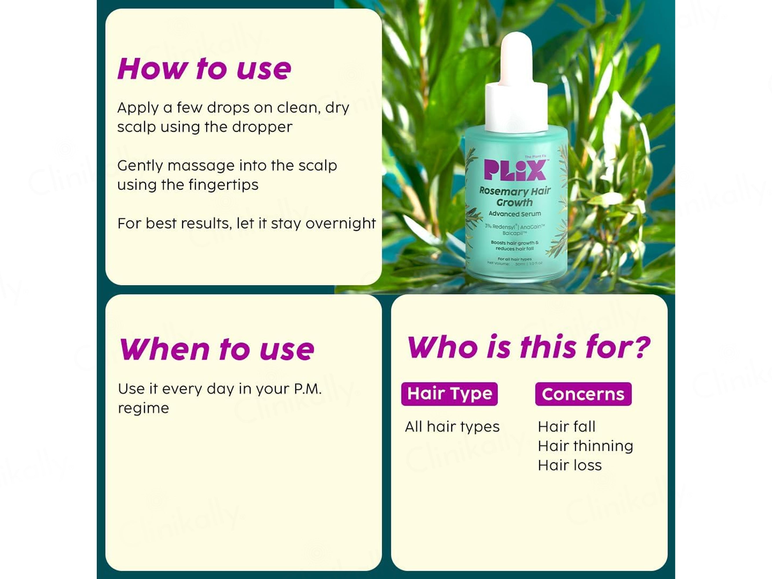Plix Rosemary Hair Growth Advanced Serum is a plant-powered solution designed to rejuvenate hair follicles, reduce hair fall, and promote thicker, fuller growth for all hair types, featuring an advanced formula with 3% Redensyl, 3% Baicapil, 4% AnaGain, and rosemary oil as key ingredients, alongside plant extracts from Spain and organic pea sprouts to stimulate scalp health, balance the hair lifecycle, and enhance density without greasiness. Redensyl rejuvenates stem cells for faster growth cycles, Baicapil fights loss with potent botanical blends, AnaGain induces new hair via regenerative properties, and rosemary oil boosts circulation to nourish follicles and prevent breakage, delivering visible improvements when applied nightly.