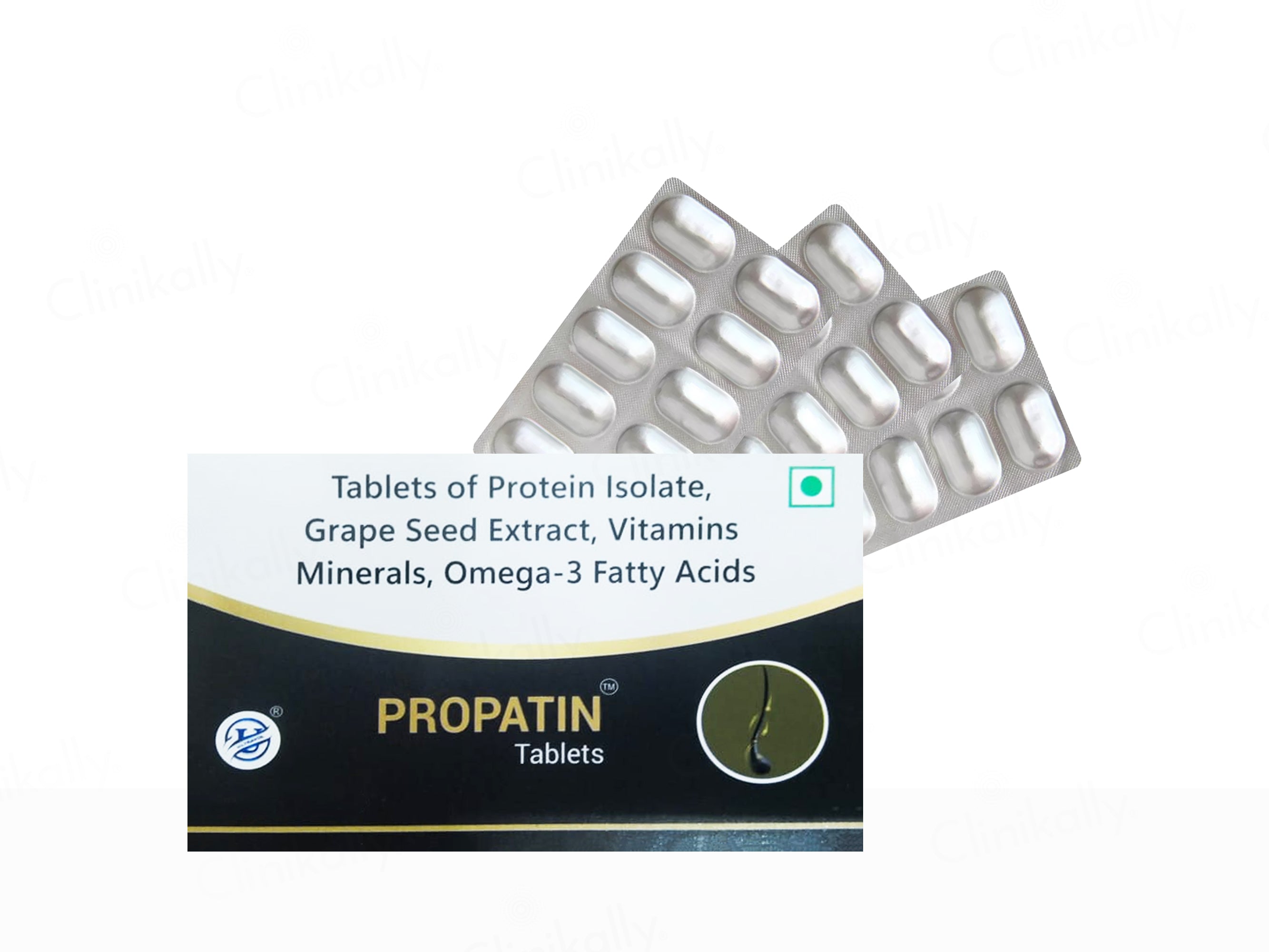 Propatin Hair Supplement Tablet is an advanced nutraceutical blend formulated to deeply nourish the hair from within by delivering a powerful combination of protein isolate, grape seed extract, essential vitamins, vital minerals, and omega-3 fatty acids, all working together to improve follicle strength, enhance scalp nutrition, and promote healthier, fuller hair growth; its antioxidant-rich composition helps protect hair follicles from oxidative damage, while the amino acids and micronutrients support keratin production, reduce breakage, minimise thinning, and restore natural shine and density. Regular use of Propatin helps reinforce weak roots, revitalise dull strands, and maintain overall scalp wellness, making it an excellent daily supplement for those experiencing hair fall, slow growth, or nutrient-deficient hair conditions.