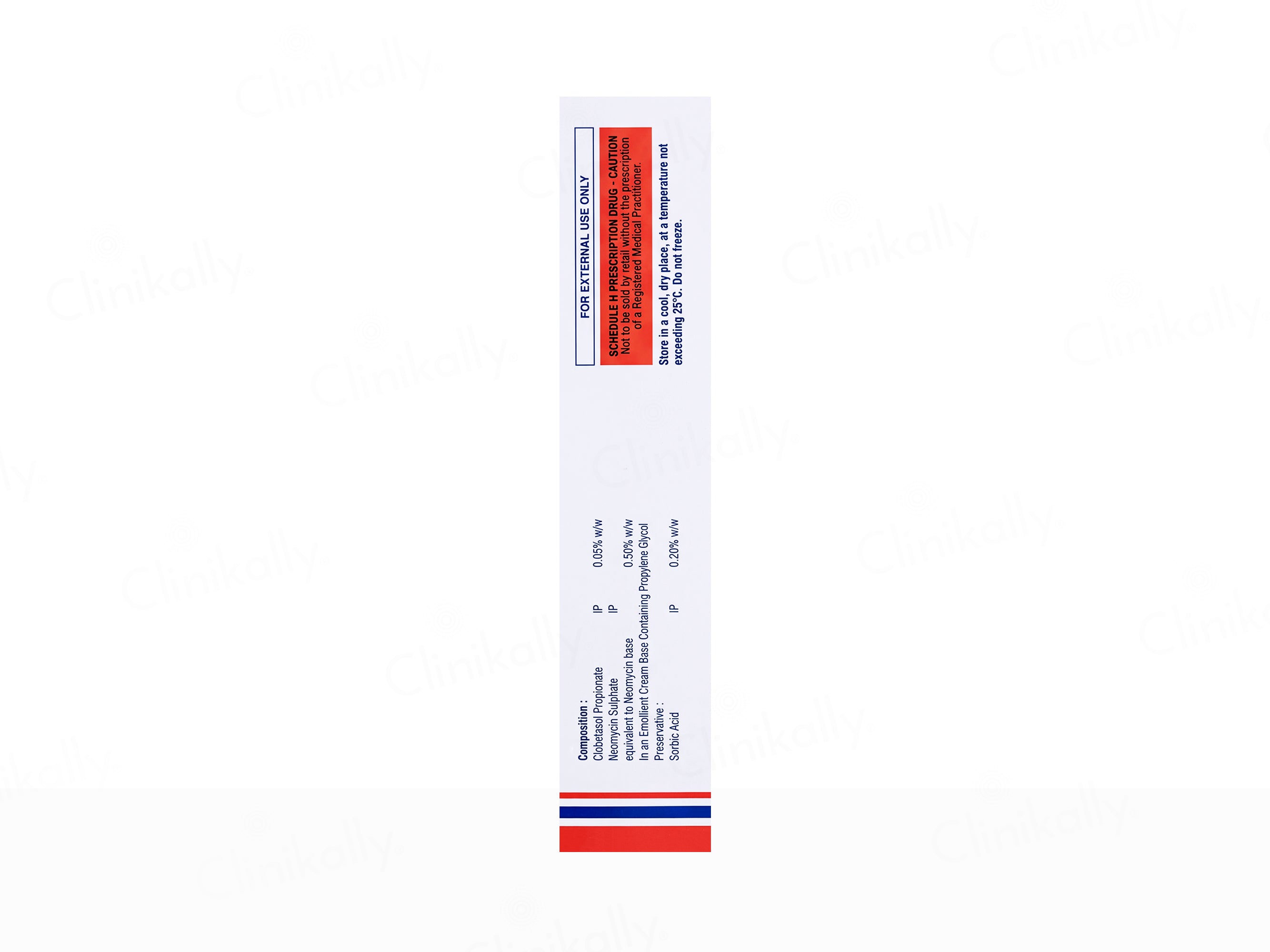Propygenta NF Cream is a combination topical medication containing Clobetasol Propionate, a highly potent corticosteroid, and Neomycin Sulphate, a broad-spectrum antibiotic. This dual-action cream helps reduce severe inflammation, redness, swelling, and itching while simultaneously treating or preventing bacterial skin infections. It is commonly prescribed for eczema, dermatitis, psoriasis flare-ups, and other steroid-responsive skin conditions with bacterial involvement. Use only under medical supervision to avoid potential side effects of strong steroids and antibiotics.
