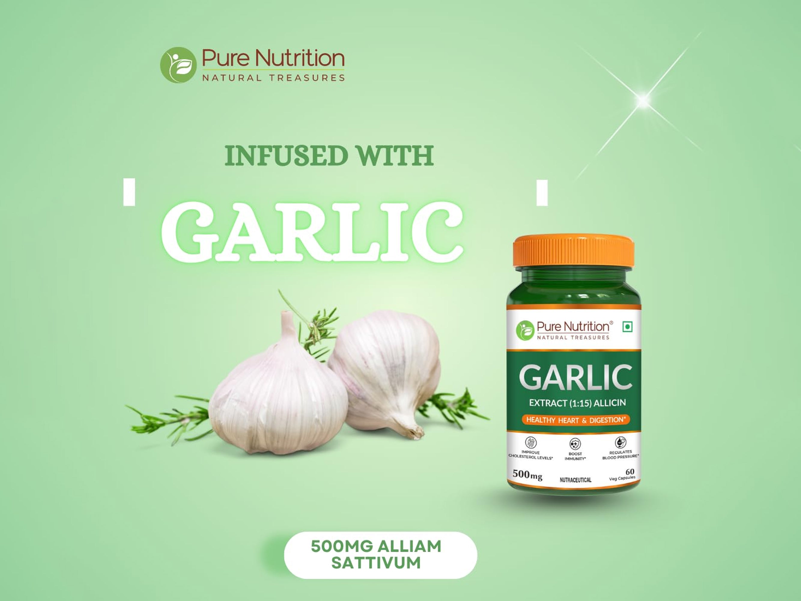 Pure Nutrition Garlic Extract (1:15) Allicin 500mg Veg Capsule is a potent herbal supplement formulated to promote cardiovascular health, support healthy digestion, and enhance immunity. Each capsule delivers 500mg of Garlic Extract standardized to a 1:15 allicin ratio, ensuring high potency and efficacy. Allicin — the key active compound in garlic — is known for its ability to naturally regulate blood pressure, improve cholesterol balance, and support circulation. It also provides antibacterial, antioxidant, and detoxifying benefits to promote overall wellness. This odor-free, easy-to-swallow vegetarian capsule is ideal for individuals seeking to improve heart health, strengthen immune response, and support digestive function naturally.