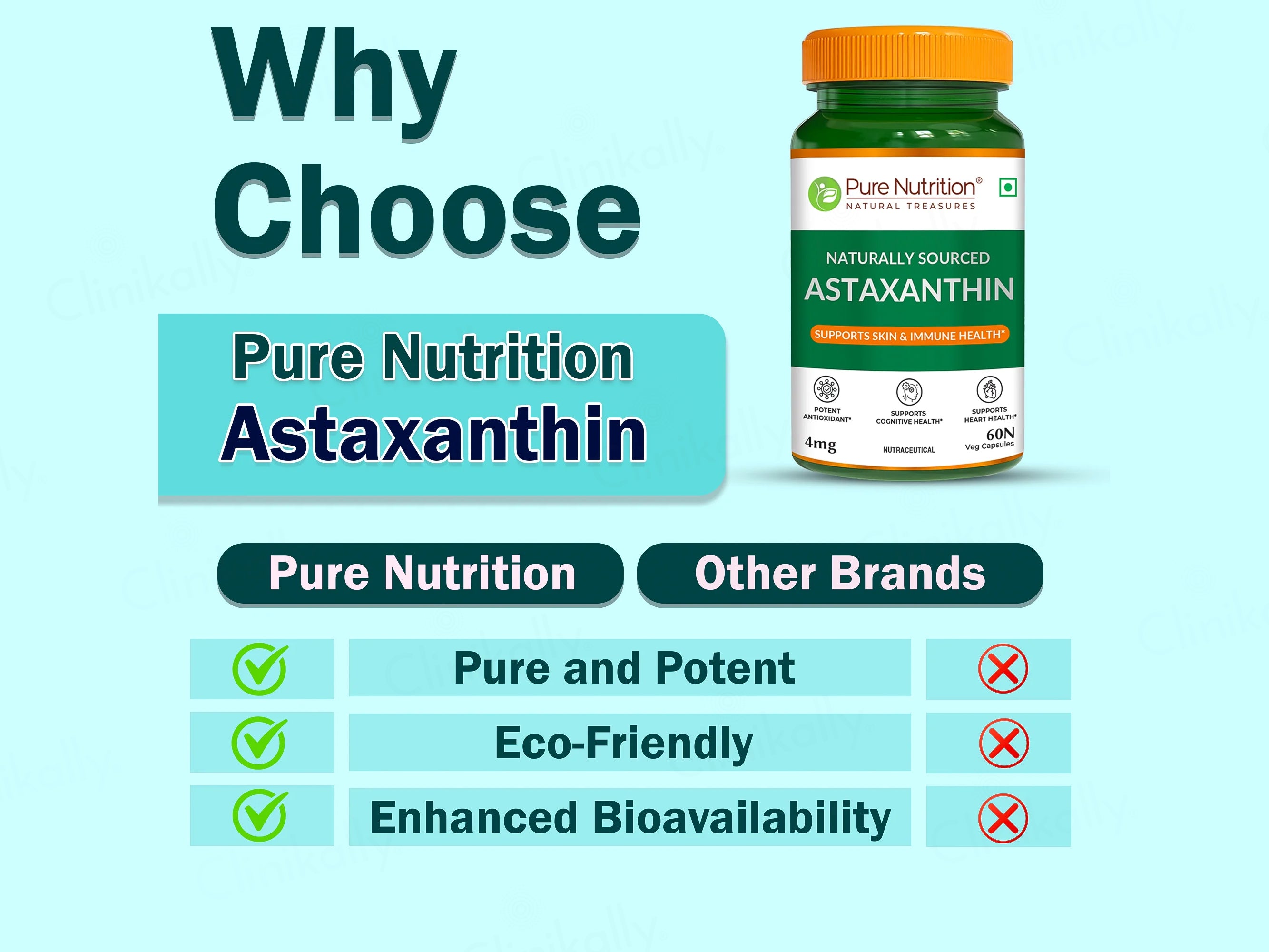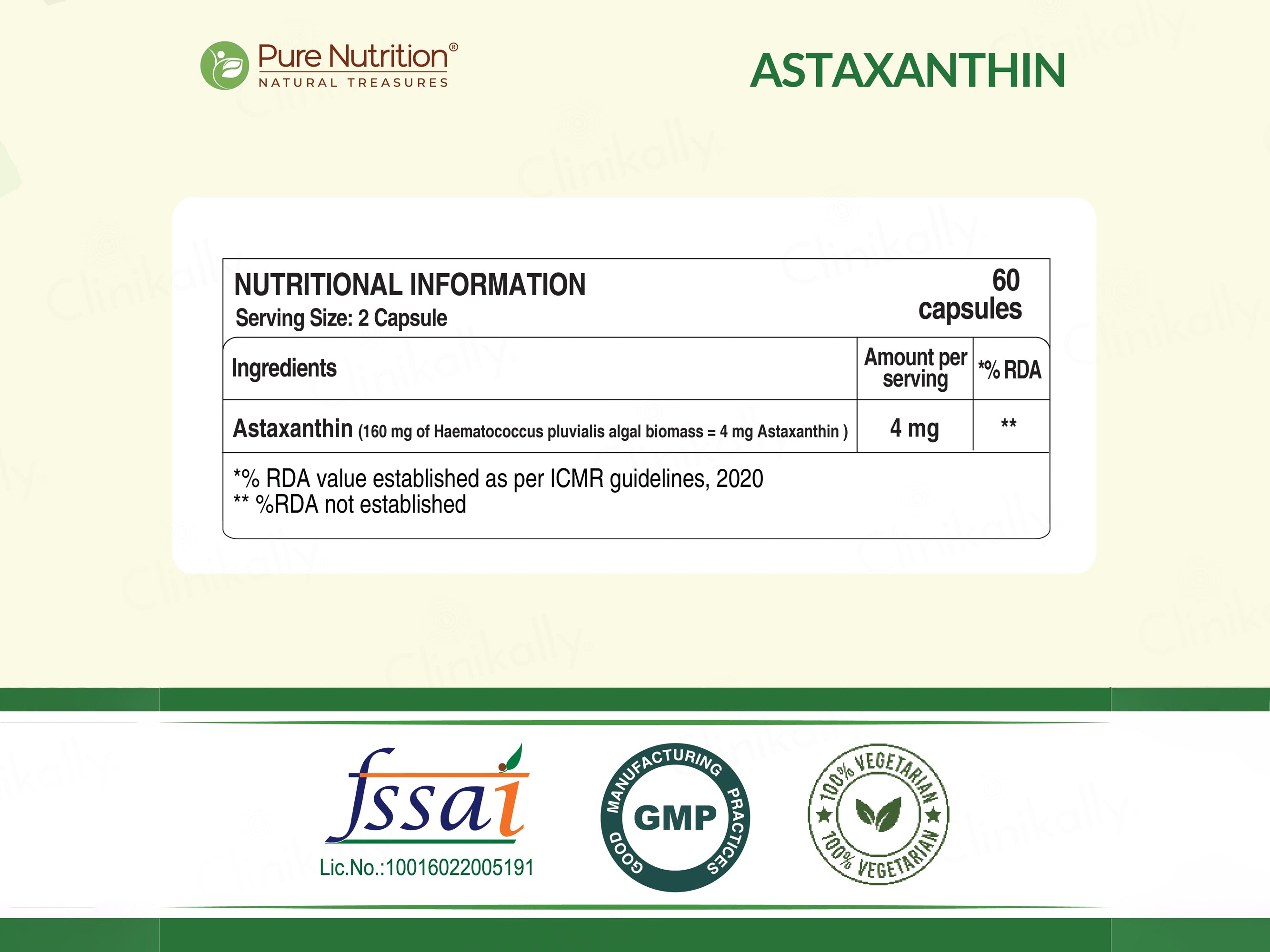 - Take 2 capsules of Pure Nutrition Naturally Sourced Astaxanthin 4mg Veg Capsule daily with meals or as directed by your healthcare professional.