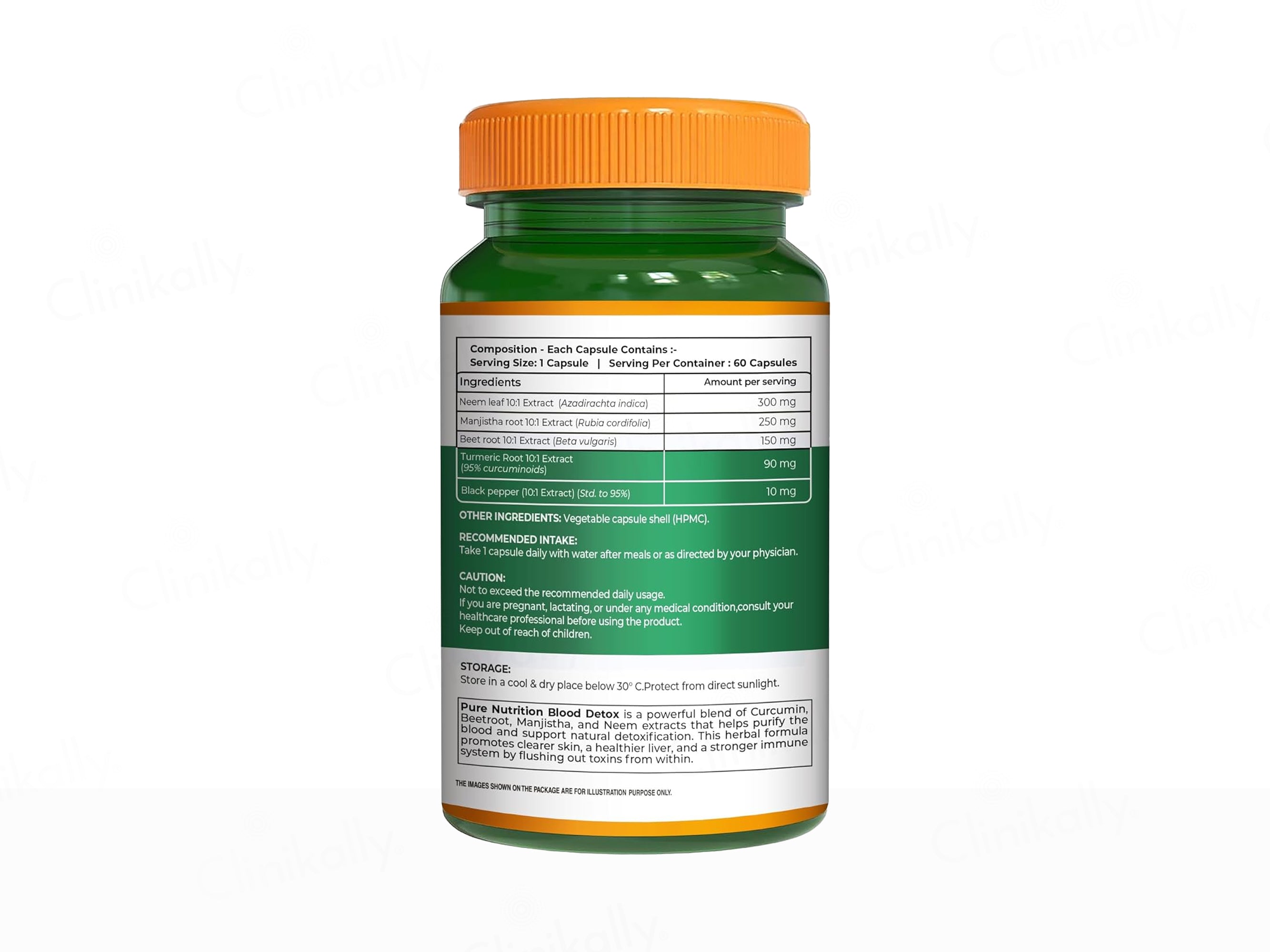 Pure Nutrition Plant Based Blood Detox 800mg Veg Capsule is a herbal nutraceutical formulated to support natural blood purification, skin health, hormonal balance, and overall detoxification using a blend of traditionally used plant extracts. It contains Neem Leaf Extract, known for its anti-bacterial and antioxidant properties that support natural blood purification and immune function, Manjistha Root Extract, traditionally used to support detoxification, skin clarity, and hormonal balance, Beet Root Extract, which helps support healthy blood circulation and overall vitality, Turmeric Root Extract, valued for its antioxidant properties and role in supporting detoxification and skin health, and Black Pepper Extract, which enhances nutrient absorption and supports digestive and detox functions. This plant-based formulation helps promote clear and glowing skin, supports natural blood cleansing, enhances hormonal balance, boosts immune function, and supports overall detoxification when taken regularly as part of a wellness-focused lifestyle.