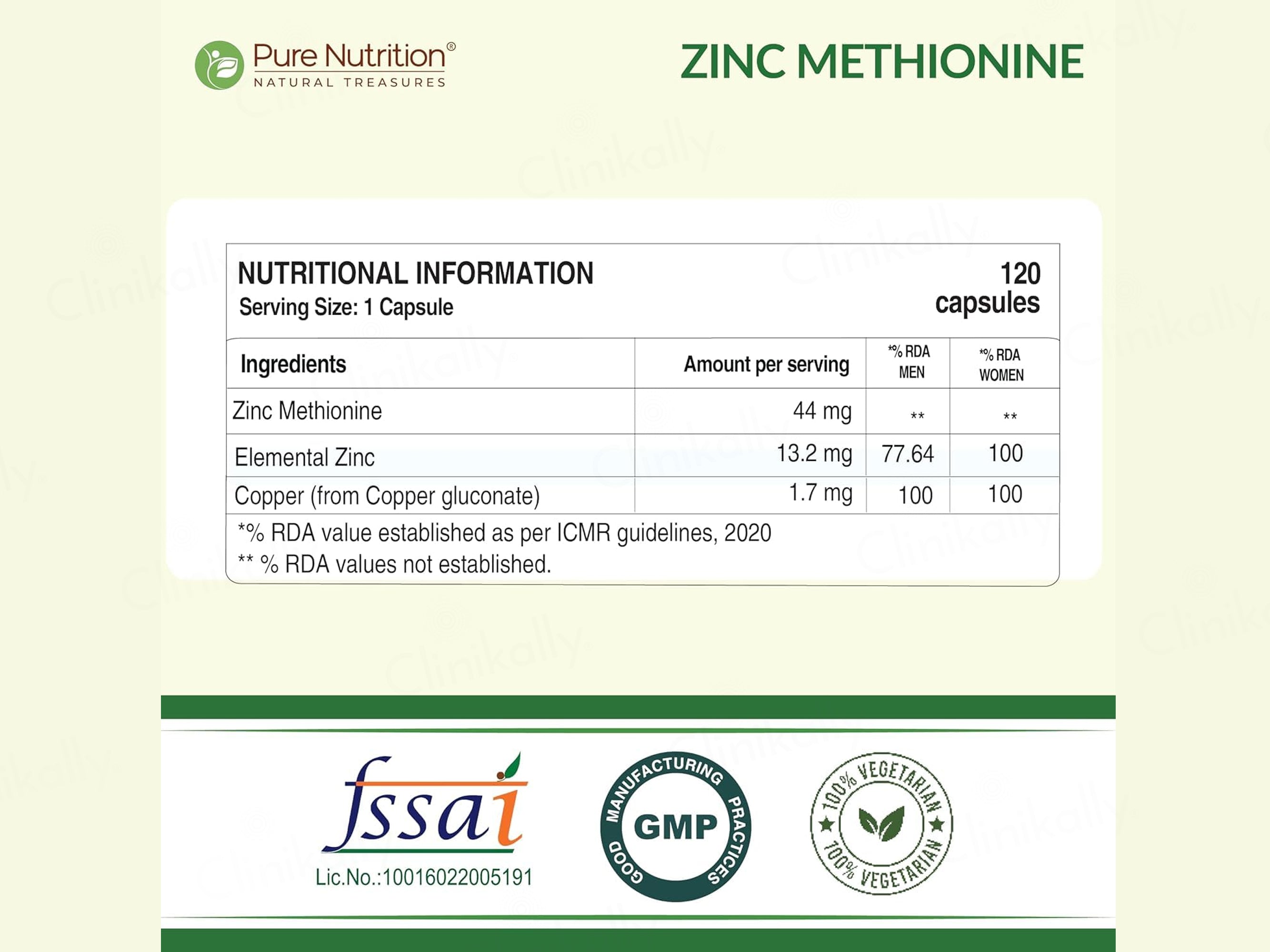 • Take 1 capsule of Pure Nutrition Zinc Methionine + Copper 45.7mg Veg Capsule daily after a meal or as directed by your healthcare professional.