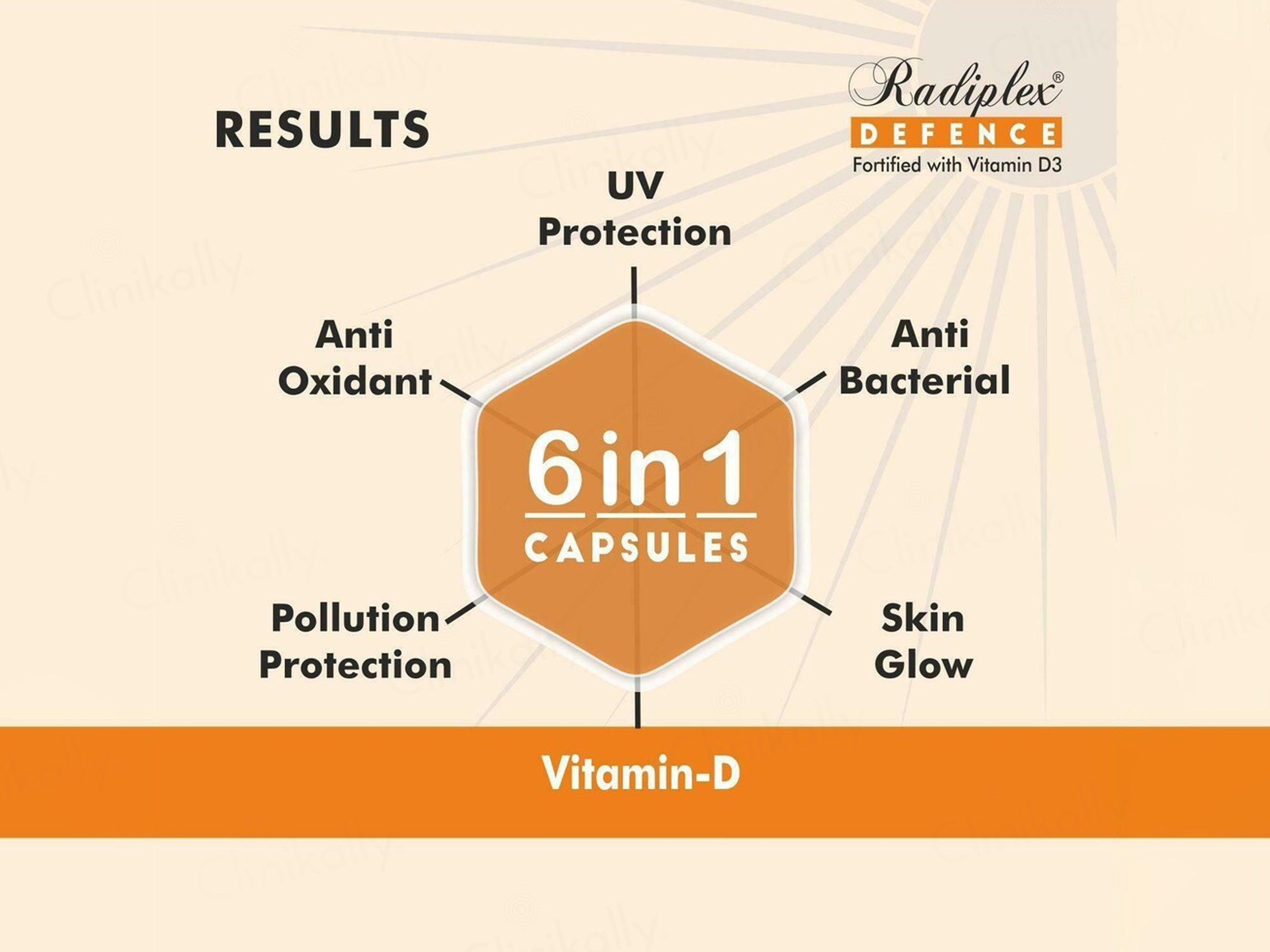 Radiplex Defence Nutraceutical Capsule offers UV/pollution shielding, inflammation reduction, enhanced hydration, immune support, and anti-aging for supple, glowing skin.