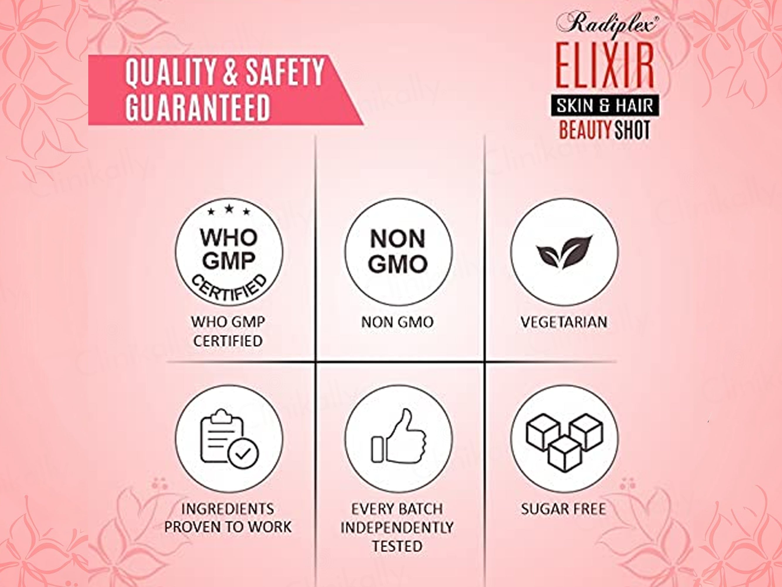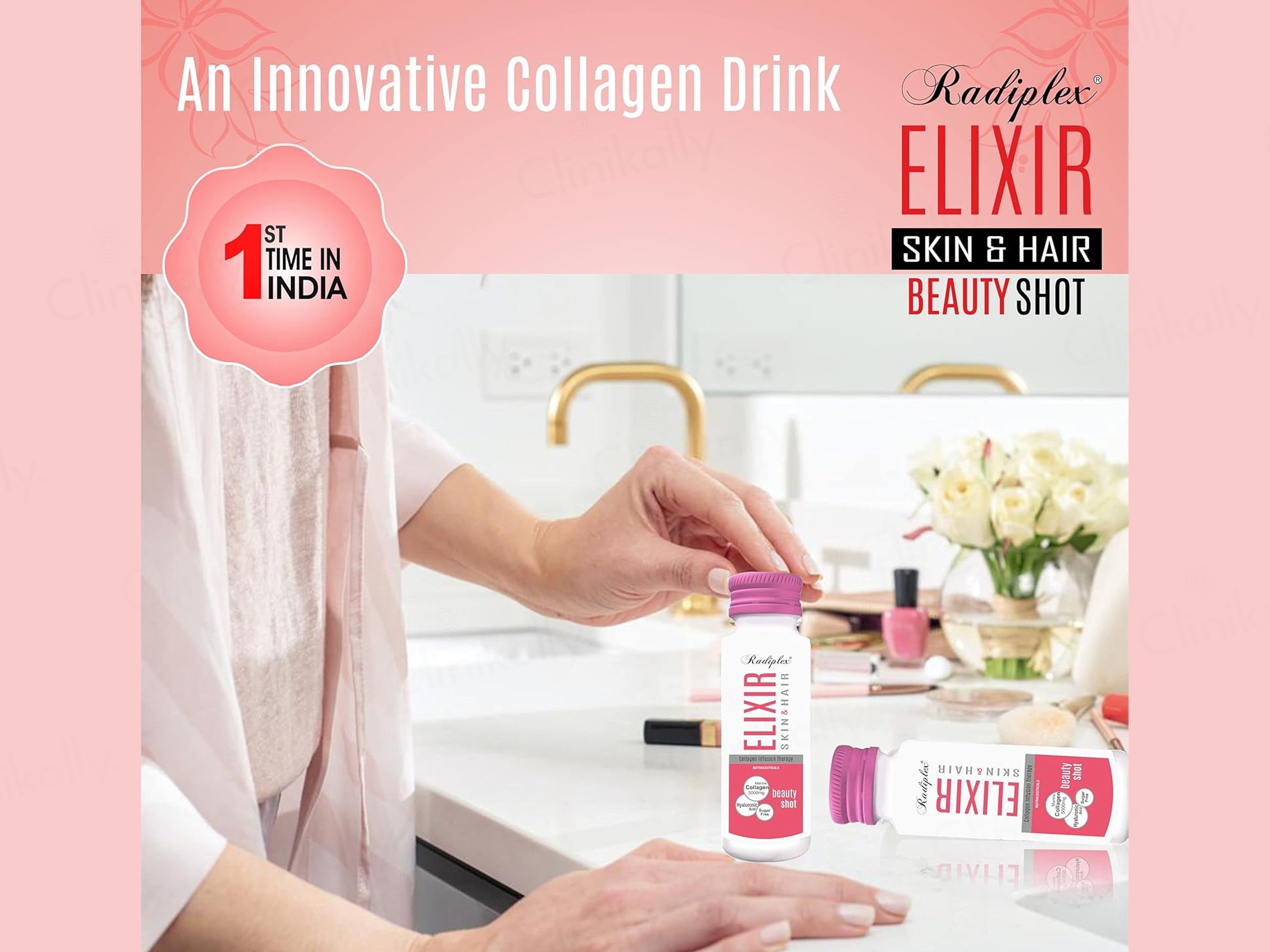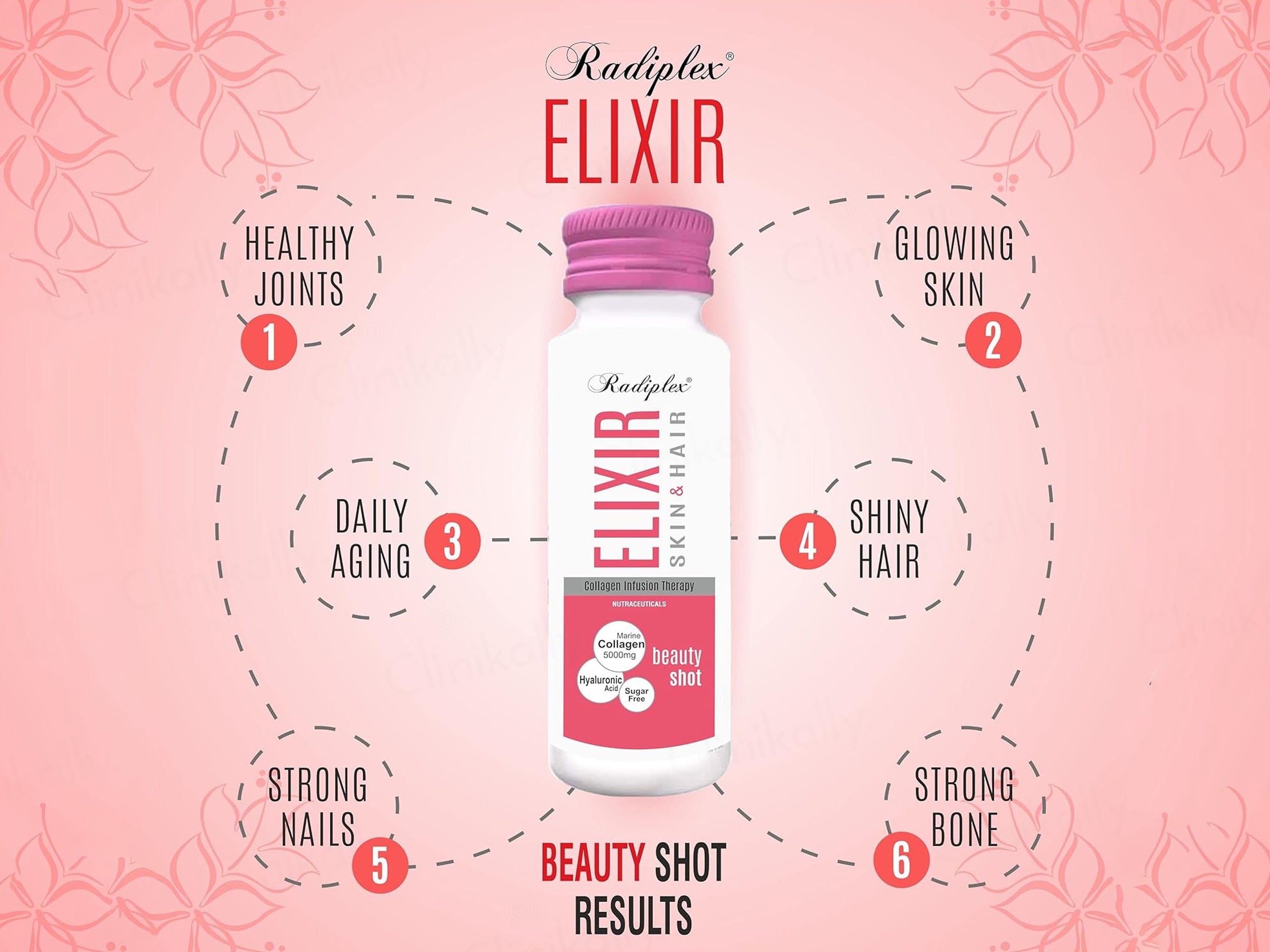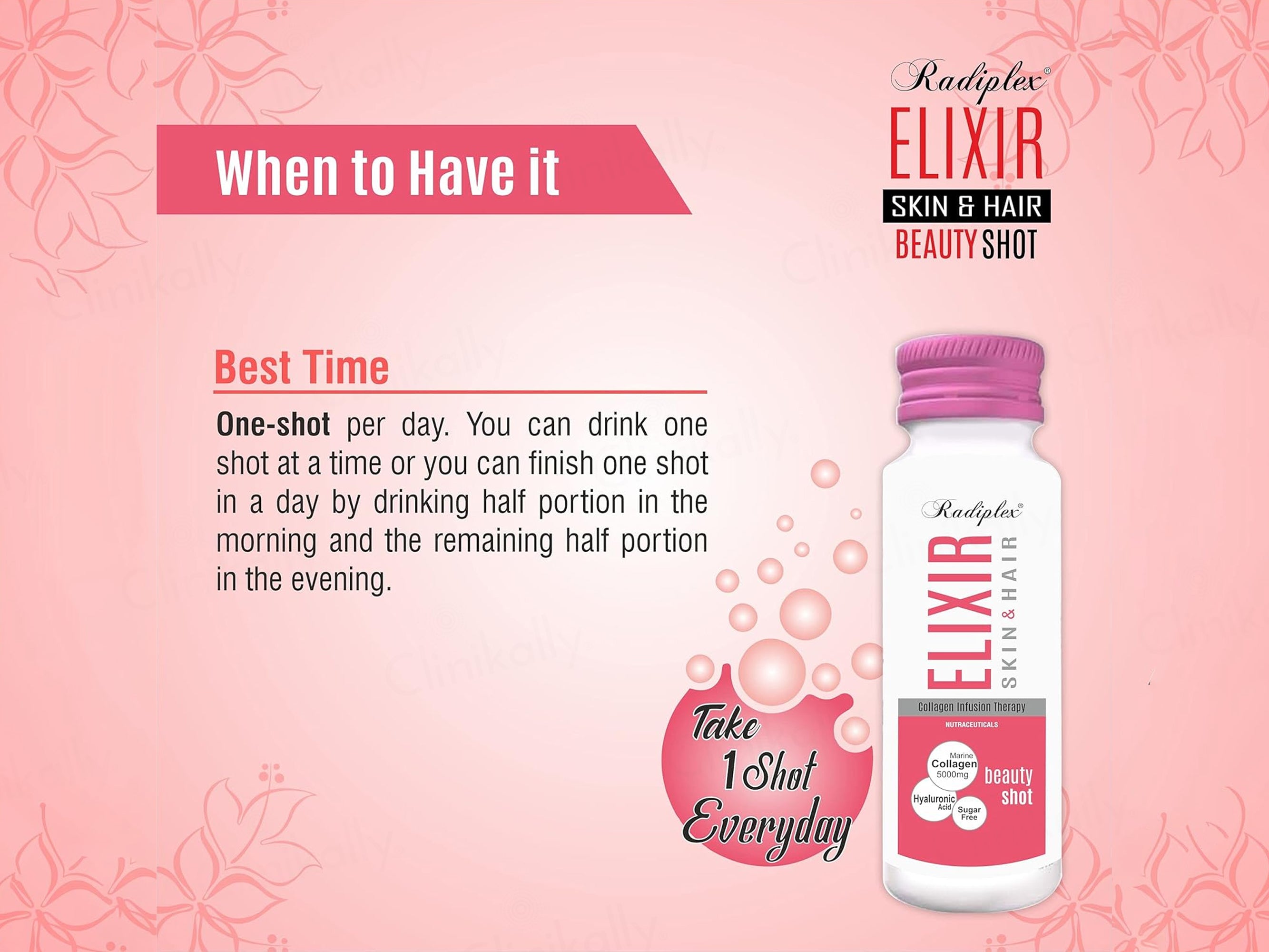 - Shake well before consuming one Radiplex Elixir Skin & Hair Collagen Infusion Therapy Beauty Shot daily on an empty stomach, preferably in the morning; twist open and drink directly or mix with water if desired.