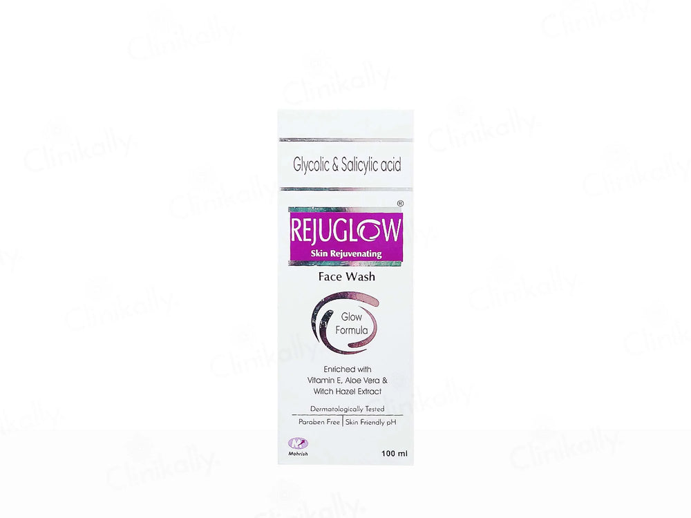 Rejuglow Skin Rejuvenating Face Wash is a dermatologist-tested formula designed to deeply cleanse, refresh, and restore your skinโs natural glow. Enriched with Vitamin E, Aloe Vera, Witch Hazel Extract, Salicylic Acid, and Glycolic Acid, it gently exfoliates dead skin cells, unclogs pores, and helps reduce acne breakouts. Its glow-boosting formula improves skin texture and tone while maintaining skin-friendly pH. Free from parabens and harsh chemicals, Rejuglow face wash is perfect for daily use, leaving your skin smooth, radiant, and rejuvenated.