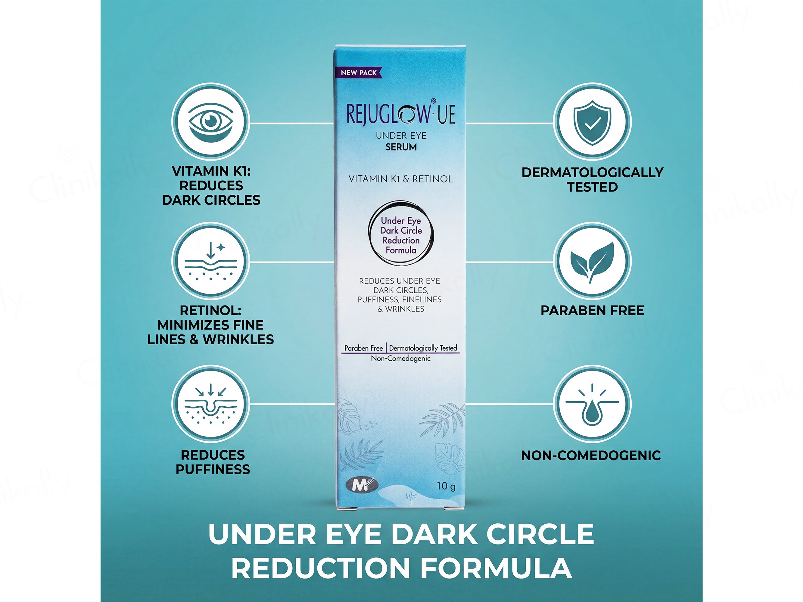 Rejuglow-UE Under Eye Serum is a targeted dark circle reduction formula powered by Vitamin K1 and retinol to visibly brighten the under-eye area. This lightweight eye serum helps fade blue and brown dark circles, smooth fine lines and crow’s feet, and reduce puffiness for a fresher, wide-awake look. Nourishing shea butter and light liquid paraffin keep the delicate eye contour soft and hydrated without feeling greasy. Paraben-free, non-comedogenic and dermatologically tested, Rejuglow-UE Under Eye Serum is ideal for daily anti-ageing, dark circle and puffiness care.