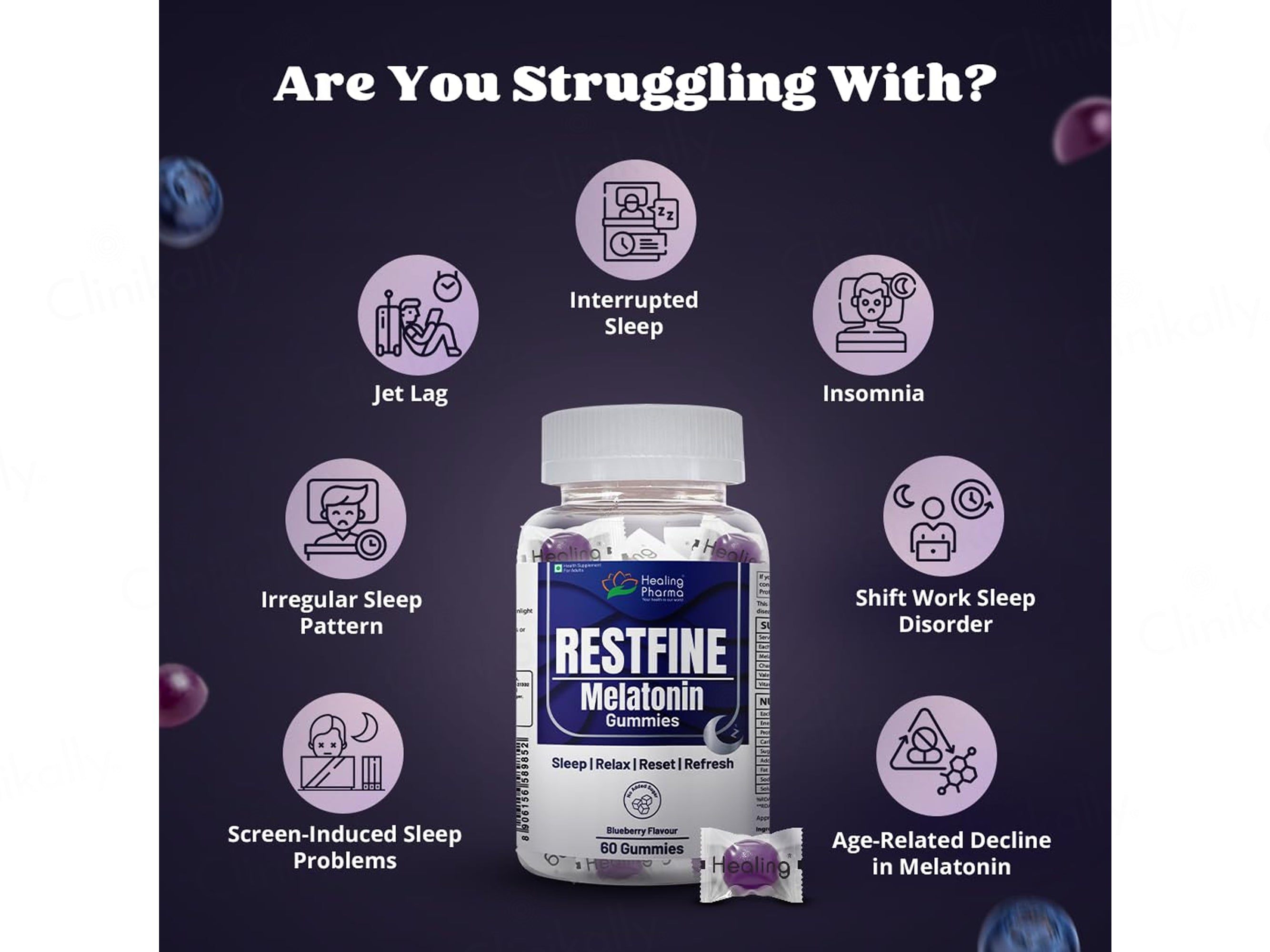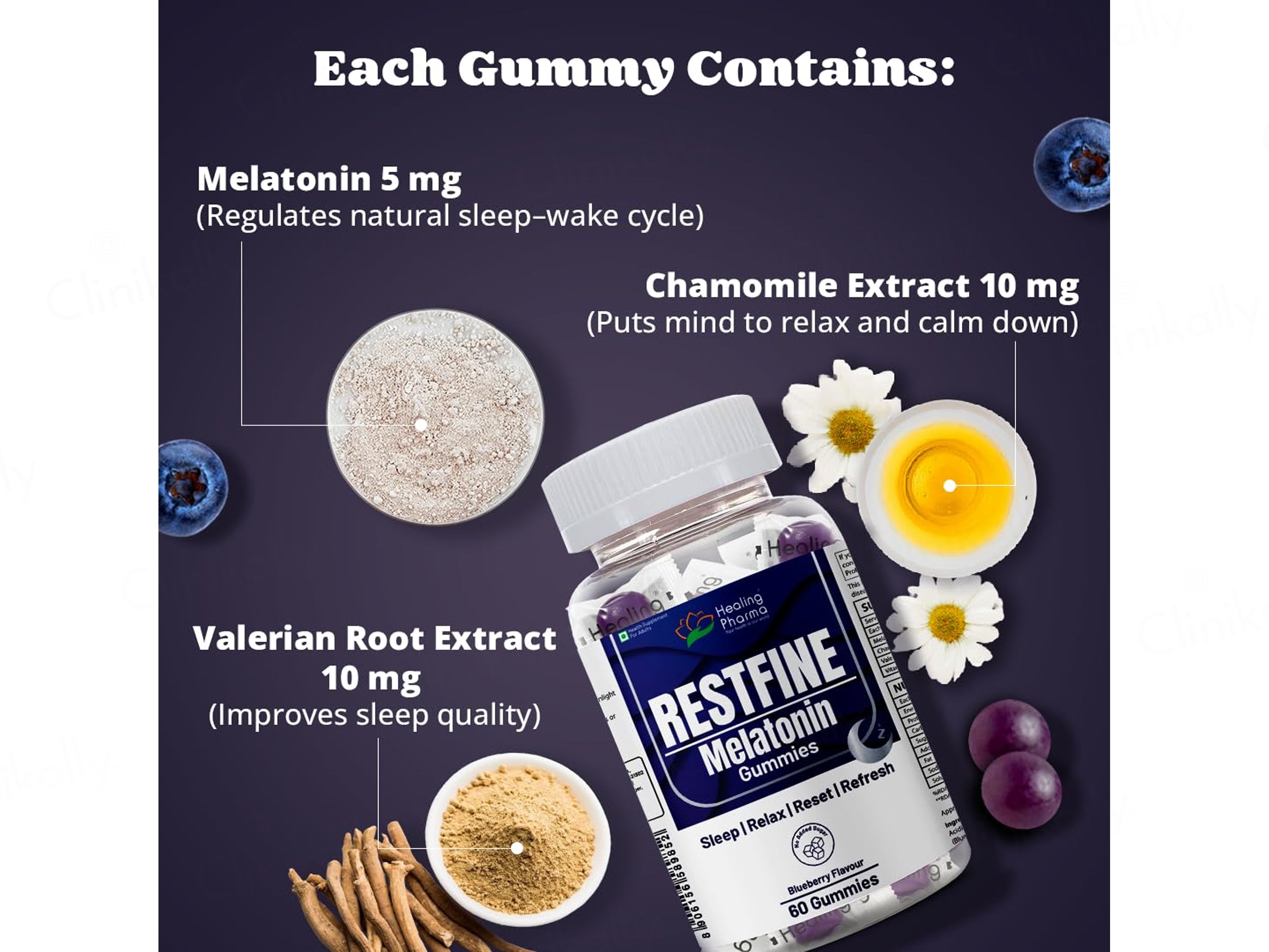 Restfine Melatonin Gummies - Blueberry Flavour are a specialized health supplement formulated for adults to support restful sleep and relaxation. Designed by Healing Pharma, these chewable gummies feature Melatonin as the primary ingredient to help regulate the sleep-wake cycle, making it easier to fall asleep and wake up feeling refreshed. The formula is enhanced with calming botanical extracts such as Chamomile and Valerian Root, which work together to relax the mind and body for a complete reset and refresh experience. Made with soluble fiber (FOS) and a pectin-based gelling agent (INS 440), these gummies offer a convenient, no added sugar alternative to traditional sleep aids. With a pleasant Blueberry flavour and easy chewable format, Restfine Melatonin Gummies provide a simple nighttime wellness solution to support the body’s internal clock and promote better-quality rest.