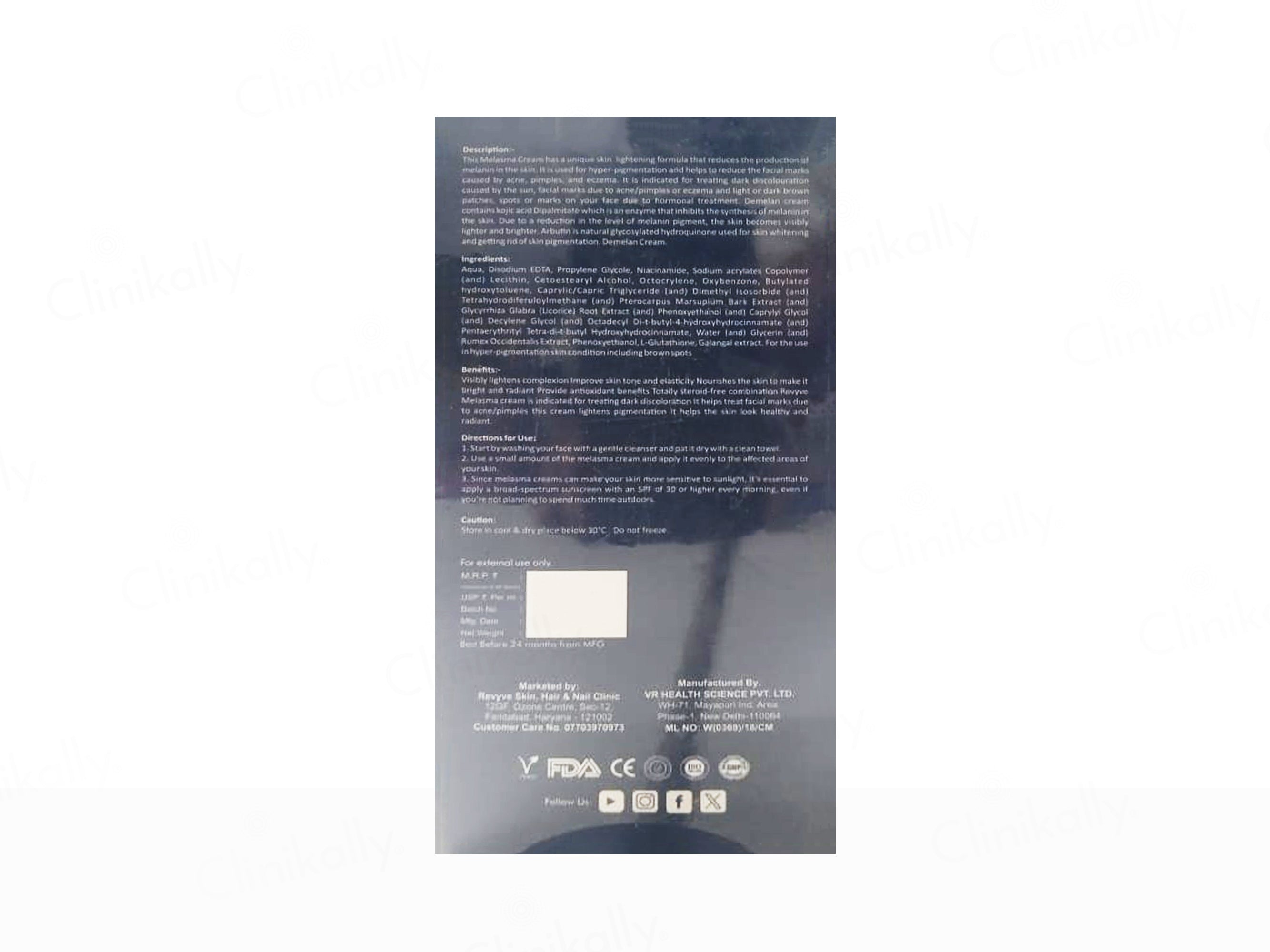 Revyve Melasma Skin Cream is a dermatologically tested, non-comedogenic depigmenting formula that targets melasma, dark spots, and hyperpigmentation with a blend of brightening and soothing actives such as Niacinamide to even skin tone, Licorice Root Extract and Calendula (Marigold) Extract to calm inflammation and fade discoloration, Caprylic/Capric Triglyceride and Cetearyl Alcohol to nourish and restore the skin barrier, and supportive ingredients like Dimethyl Isosorbide, Propylene Glycol, Hydroxyethylcellulose, Burdock Extract, Lecithin, and Sodium Acrylates Copolymer for enhanced absorption, hydration, and skin repair—helping the skin appear more radiant, smooth, and evenly toned with consistent use.