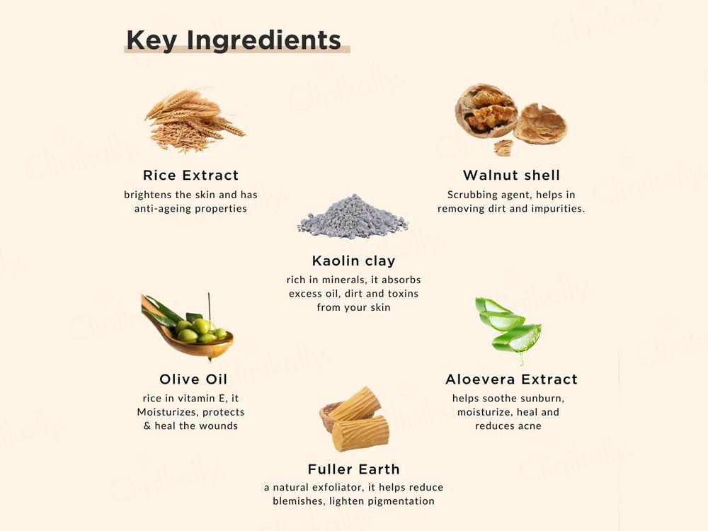 Key ingredients include rice bran, walnut shell powder, and licorice extract.