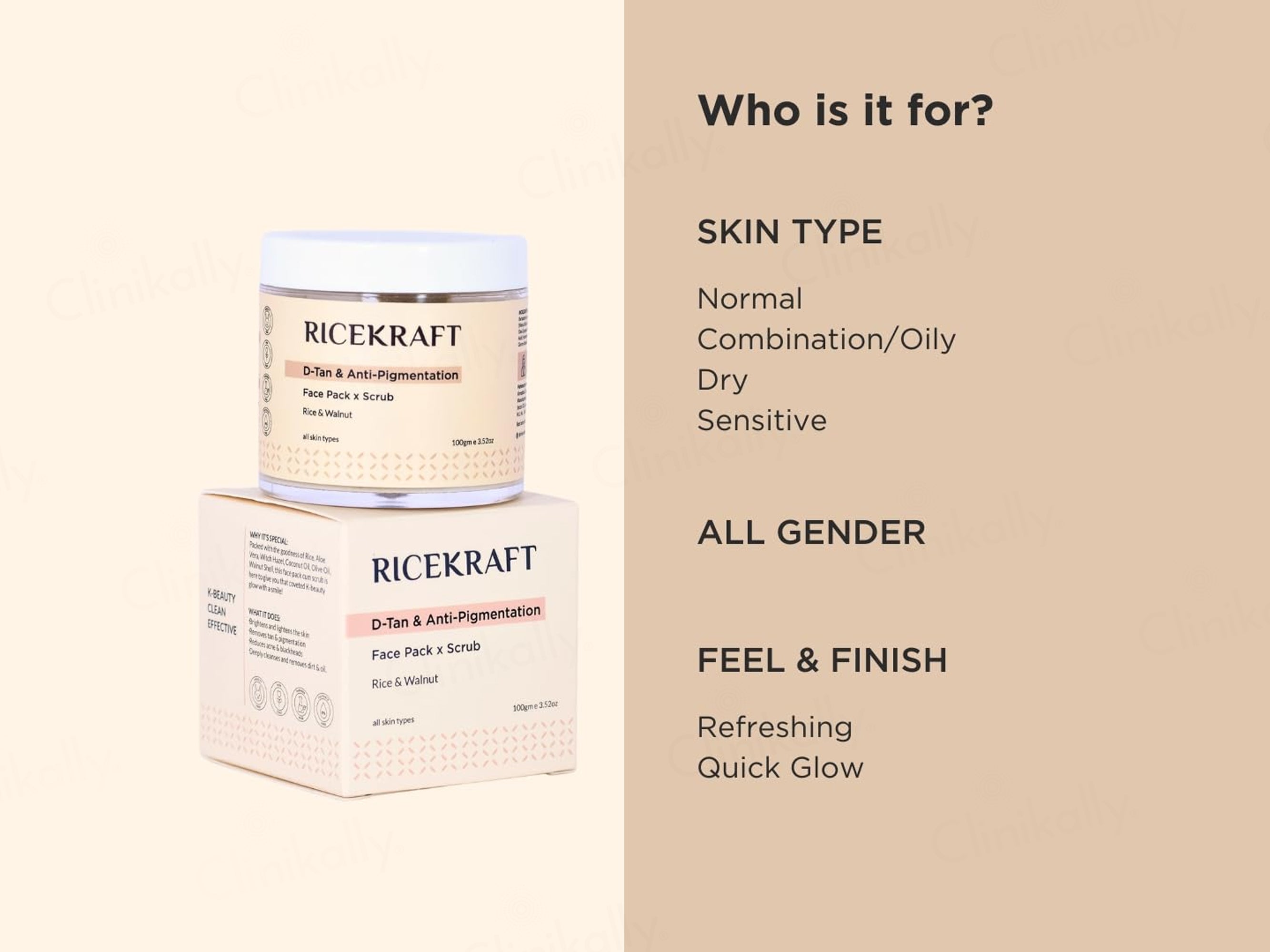 RiceKraft Rice & Walnut D-Tan & Anti-Pigmentation Face Pack & Scrub is a dual-action skincare product designed to exfoliate, reduce tan, and combat pigmentation for a brighter, even-toned complexion. Infused with rice bran, walnut shell powder, and licorice extract, it gently removes dead skin, lightens tan marks, and fades dark spots while nourishing the skin. Its creamy, non-abrasive formula leaves skin smooth and radiant. Suitable for all skin types, this product promotes clarity and glow with regular use.