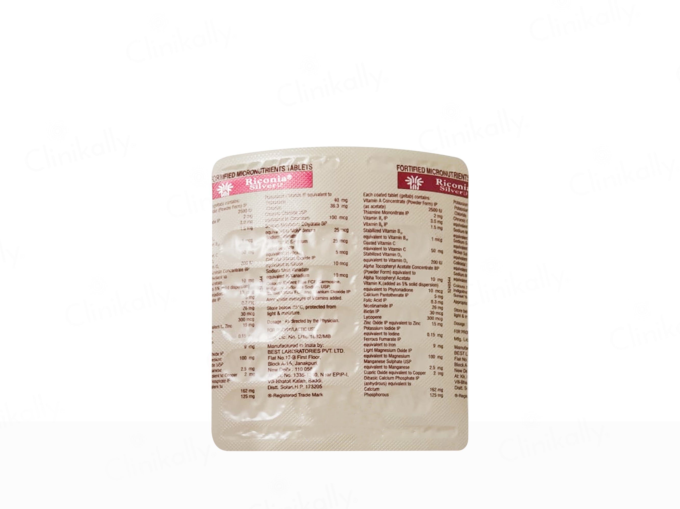 Riconia Silver LP Tablet is a fortified micronutrient supplement specially formulated for advanced nutritional support, targeting improved energy, immunity, and cellular health in adults and the elderly. It contains a comprehensive blend of essential vitamins and minerals such as Vitamin A, Vitamin C, Vitamin D3, Vitamin E, Vitamin B1, Vitamin B2, Vitamin B6, Vitamin B12, Niacinamide, Folic Acid, Biotin, Calcium Pantothenate, Zinc, Iron, Magnesium, Manganese, Copper, Iodine, Chromium, Selenium, and Lycopene. These nutrients work together to promote antioxidant protection, enhance metabolism, and strengthen immunity. Lycopene and Vitamins A, C, and E provide potent antioxidant benefits, reducing oxidative stress, while the B-complex group supports energy production and nervous system function. Minerals like Zinc, Iron, and Magnesium aid in maintaining healthy blood, muscle function, and overall vitality. Regular intake of Riconia Silver LP Tablet helps combat fatigue, supports heart and bone health, and maintains overall wellness, especially for individuals with increased nutritional demands.