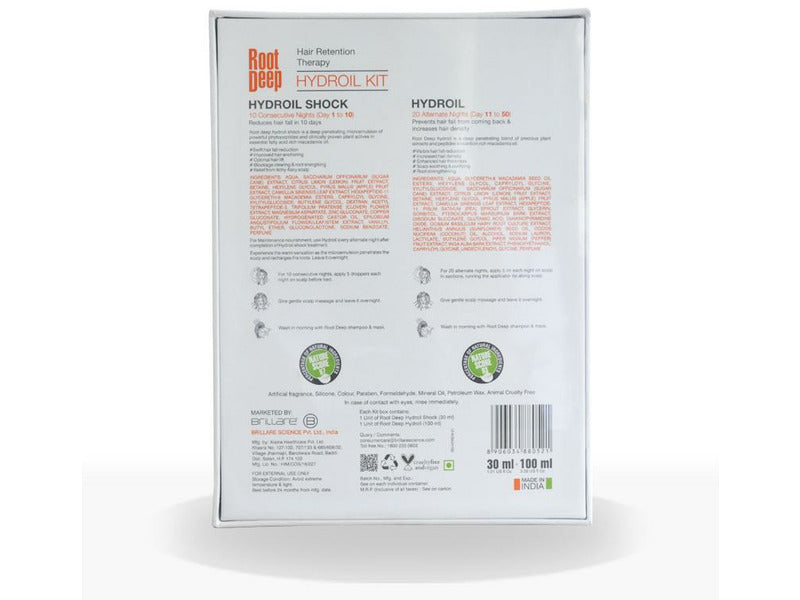 - Use Root Deep Hair Retention Therapy Hydroil Shock initially for fighting severe hair fall then switch to Root Deep Hair Retention Therapy Hydroil for prolongeed maintenance therapy.