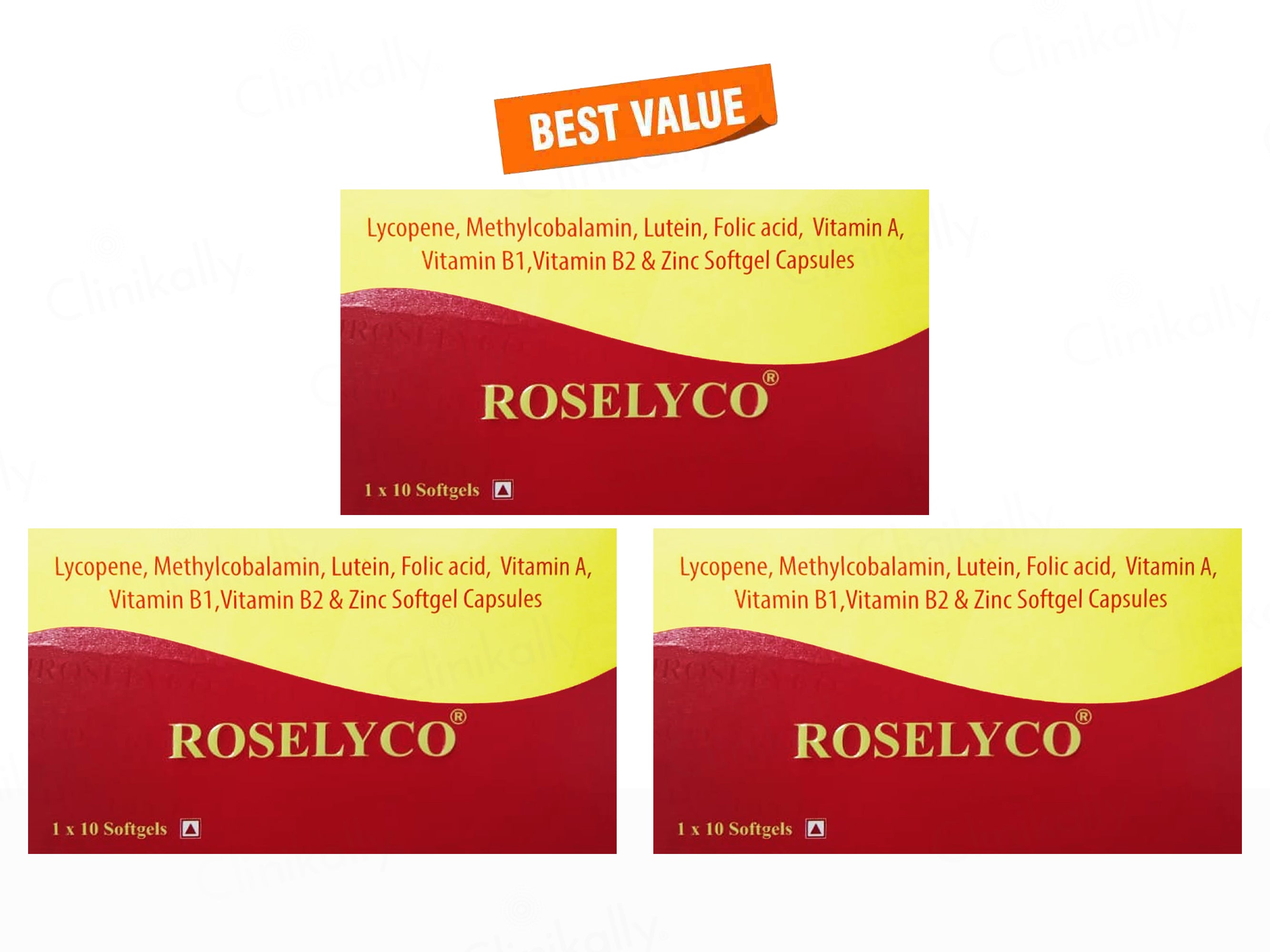 Roselyco Softgel Capsule is a health supplement that combines essential nutrients for overall wellness, promoting skin health and improving body functions. It contains a blend of vitamins, minerals, and antioxidants like Lycopene, Methylcobalamin, Lutein, and Folic Acid to support immune health, skin, and vision. This easy-to-take softgel is ideal for daily supplementation to meet your nutritional needs and promote a healthy lifestyle.