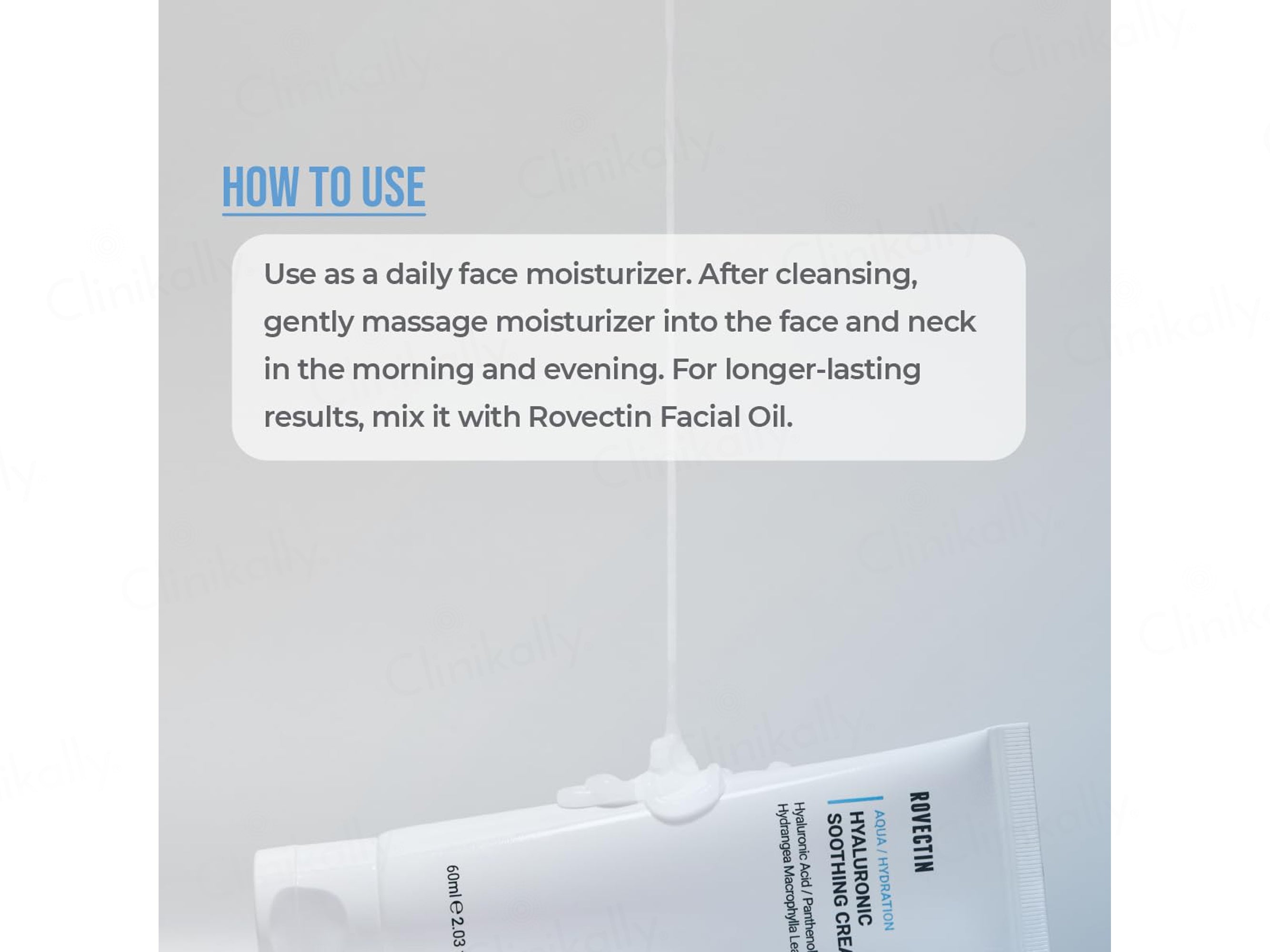 - Use as a daily face moisturizer. After cleansing, gently massage into the face and neck in the morning and evening. For longer-lasting results, mix it with Rovectin Facial Oil.