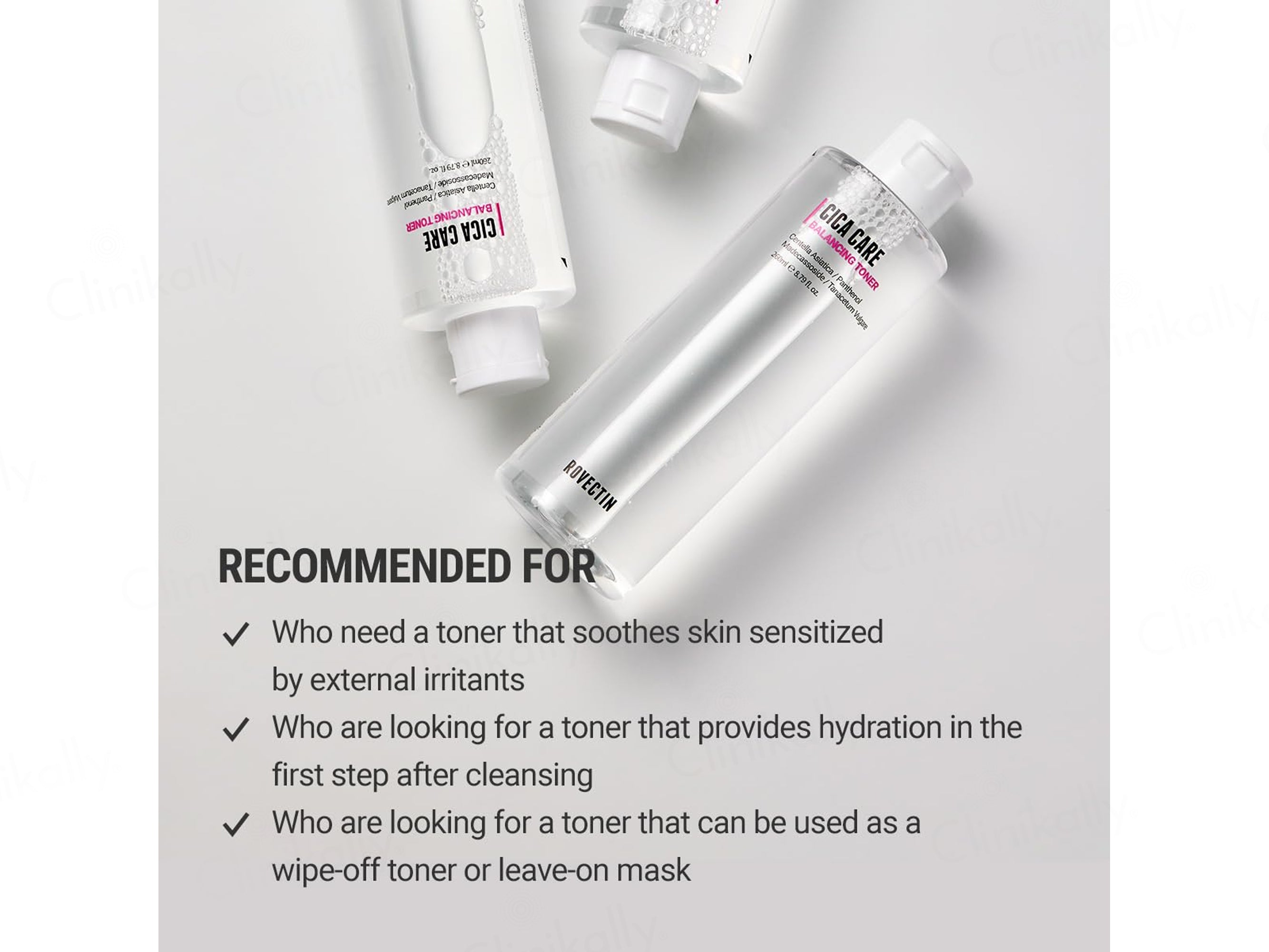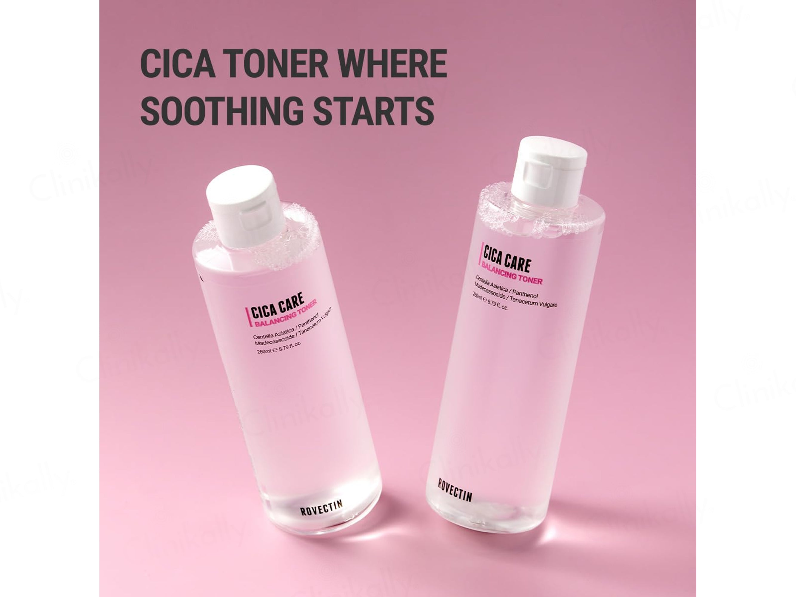 Rovectin Cica Care Balancing Toner is a gentle, hydrating toner designed to soothe, calm, and balance sensitive or irritated skin, formulated with Centella Asiatica Extract, Madecassoside, Panthenol, and amino acids to support skin comfort while removing impurities left after cleansing. The lightweight, fast-absorbing texture helps maintain pH balance, reduce excess oil, and prepare the skin for the next steps in your routine, making it suitable for sensitized, acne-prone, or environmentally stressed skin with added soothing benefits from Tanacetum Vulgare Extract, Hedera Helix Leaf/Stem Extract, and Pyrus Malus Fruit Extract.