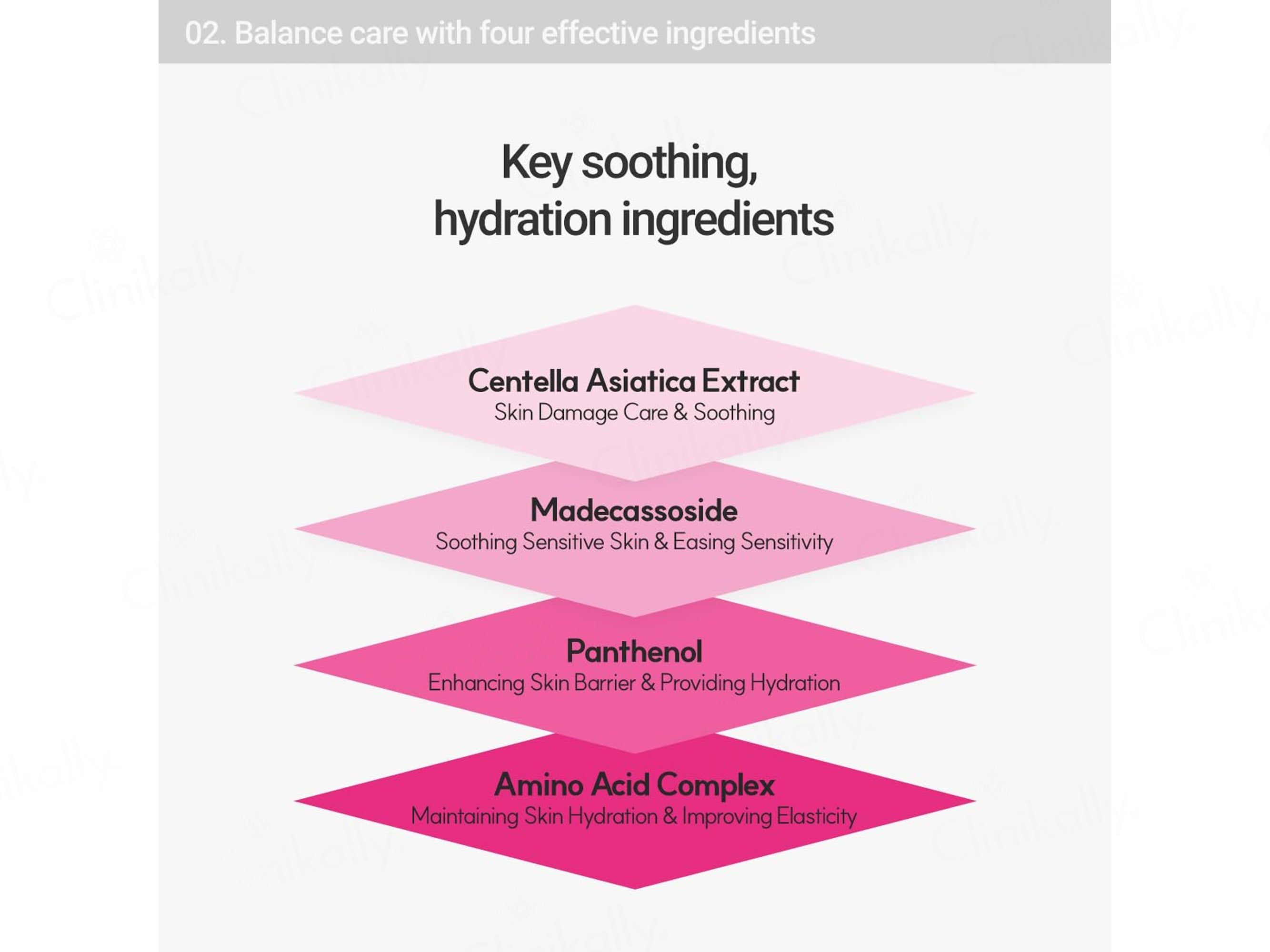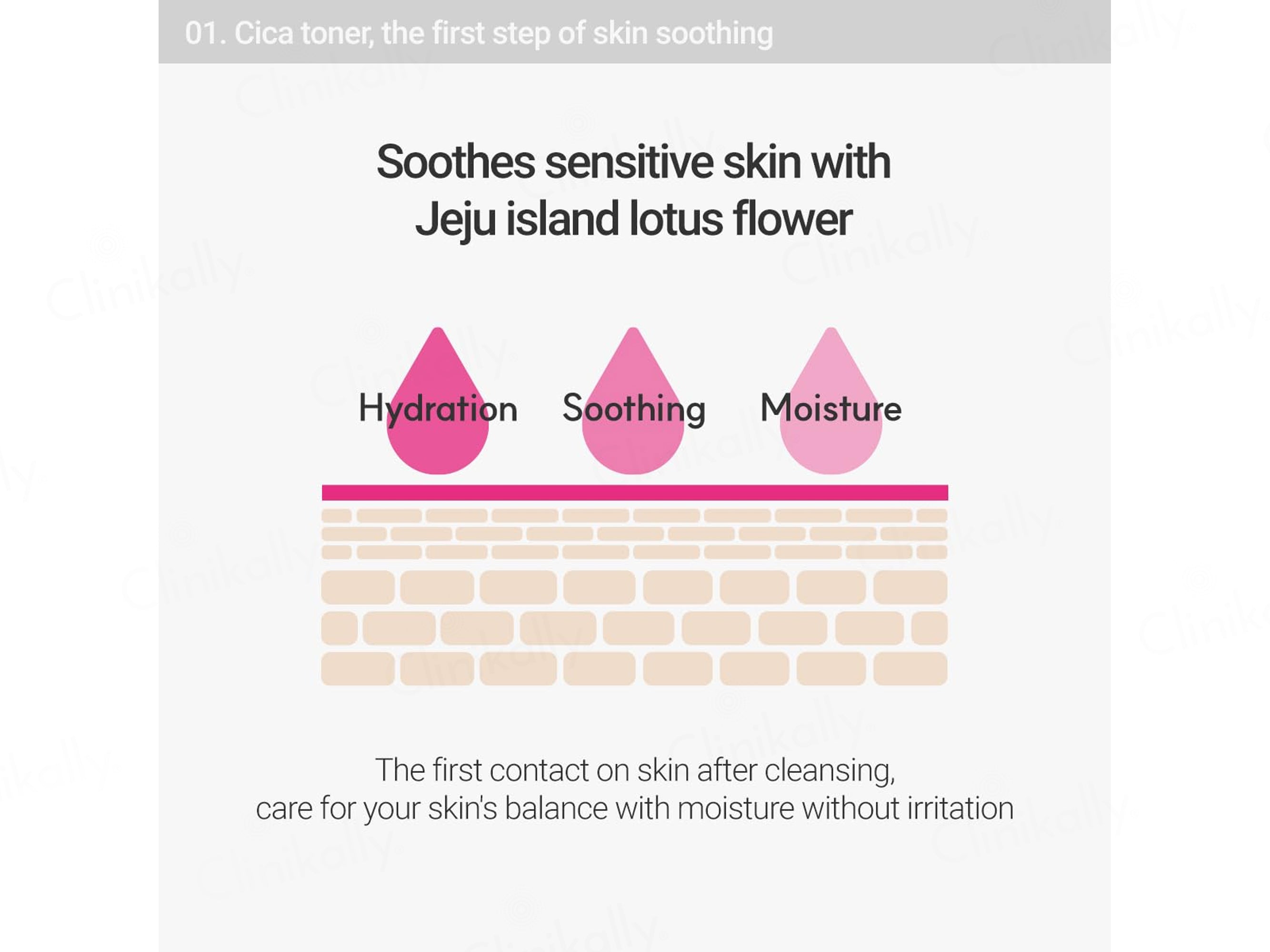 - After cleansing, soak a cotton pad with Rovectin Cica Care Balancing Toner and gently wipe the face outward to remove impurities and prep the skin for further steps.