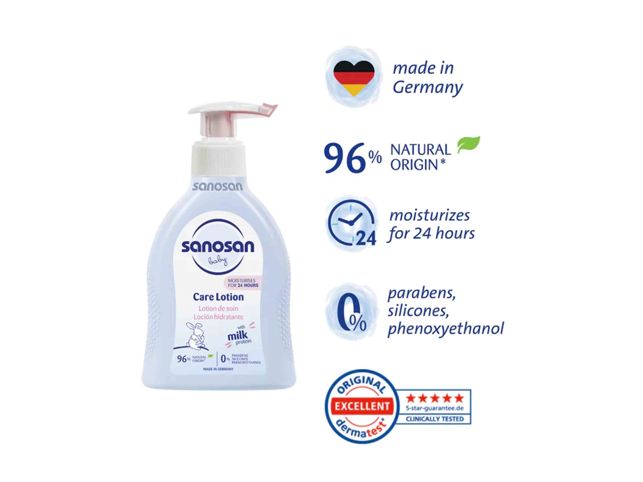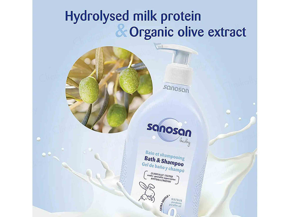 Sanosan Baby Milk Protein Bath & Shampoo is a gentle 2-in-1 cleanser specially formulated for delicate baby skin and hair. Enriched with organic olive extract and milk protein, it nourishes, hydrates, and protects your baby’s sensitive skin while maintaining natural moisture balance. Clinically tested under specialist supervision, this hypoallergenic formula is free from SLS, SLES, parabens, and paraffin oil, ensuring safe daily care. Its mild cleansing action leaves baby’s skin soft and smooth, and hair silky and easy to manage. Perfect for everyday gentle baby care.