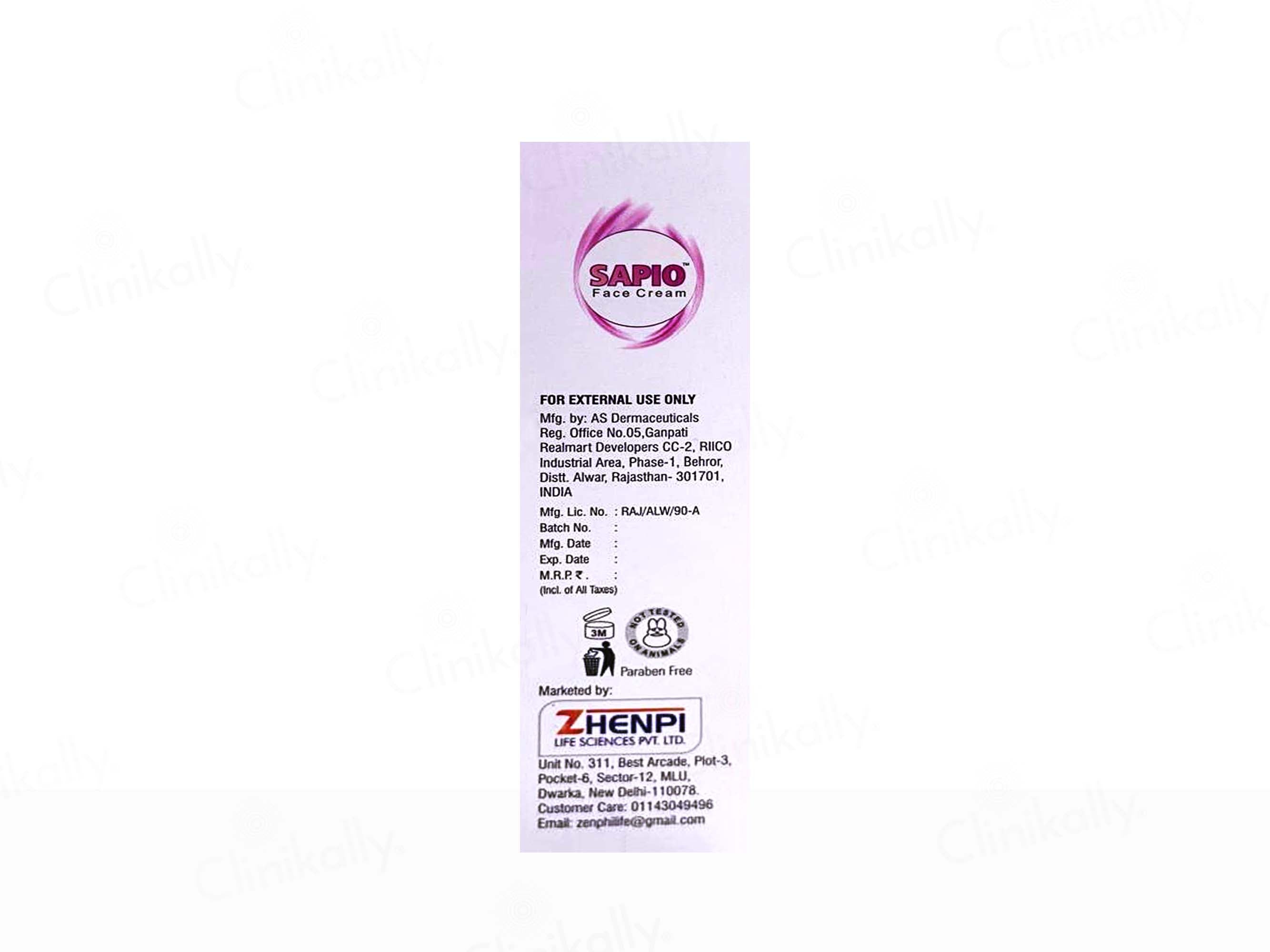 Sapio Face Cream is a natural skin moisturizing formula designed to help lighten skin tone and reduce fine lines. It contains Aloe Vera, Almond Oil, Sesame Protein, and Simondsia Chinensis Seed Extract to deeply nourish and hydrate the skin. Enriched with Titanium Dioxide for sun protection, it supports an even, radiant complexion while preventing UV damage. Ideal for daily use, Sapio Face Cream combines botanical extracts and advanced actives to deliver smooth, youthful, and well-protected skin.