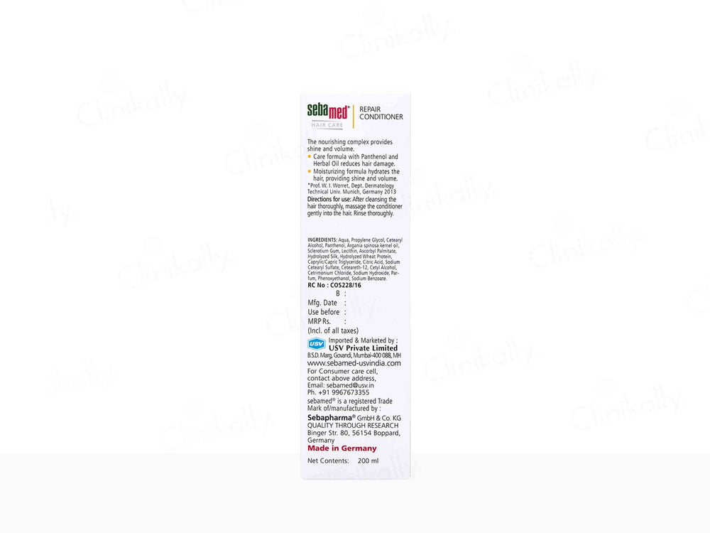 Sebamed Hair Repair Conditioner contains a blend of nourishing ingredients, including silk proteins and plant extracts, that deeply penetrate hair fibers to repair, hydrate, and strengthen hair from the inside out.