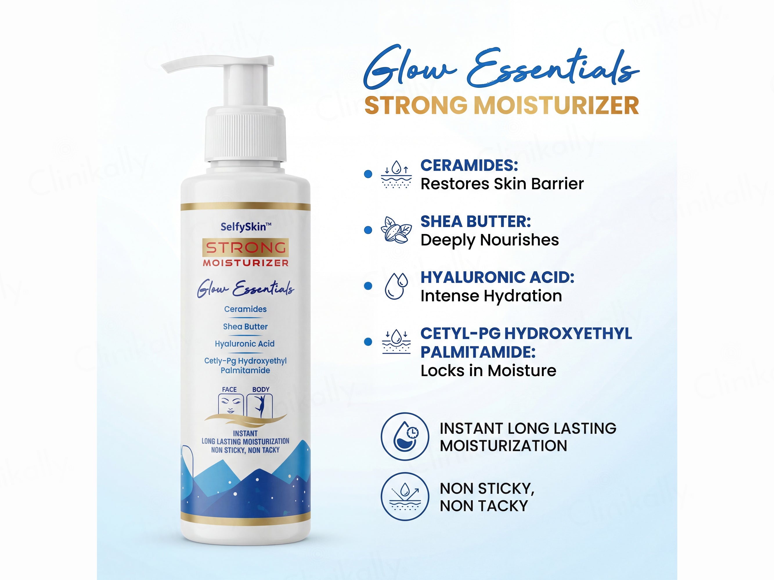 SelfySkin Strong Instant Face & Body Moisturizer is a rich yet non-sticky, long-lasting hydration cream designed for intense moisture replenishment and glow enhancement across face and body, ideal for dry, dehydrated, rough, or winter-prone skin; this fast-absorbing, glow essentials formula creates an instant plump, soft, and radiant finish without greasiness or tackiness, while deeply nourishing, repairing the skin barrier, and locking in moisture for all-day comfort and protection against environmental dryness, suitable for daily use on face, neck, hands, elbows, knees, and body to deliver smoother texture, reduced flakiness, and a healthy, dewy glow. Key ingredients include multiple Ceramides (Ceramide 1, 2, 3, 6 II) for comprehensive barrier repair and strengthening to prevent transepidermal water loss, Hyaluronic Acid for multi-level hydration and plumping, Shea Butter for rich emollience and soothing nourishment, Niacinamide (implied via Cetyl Hydroxyethyl Palmitamide or similar) for brightening, calming, and barrier support, Glycerin for humectant moisture draw, Light Liquid Paraffin and Dimethicone for smooth, protective film-forming, along with Tocopheryl Acetate (Vitamin E) for antioxidant defense and Sweet Almond Oil for gentle softening and lipid replenishment.