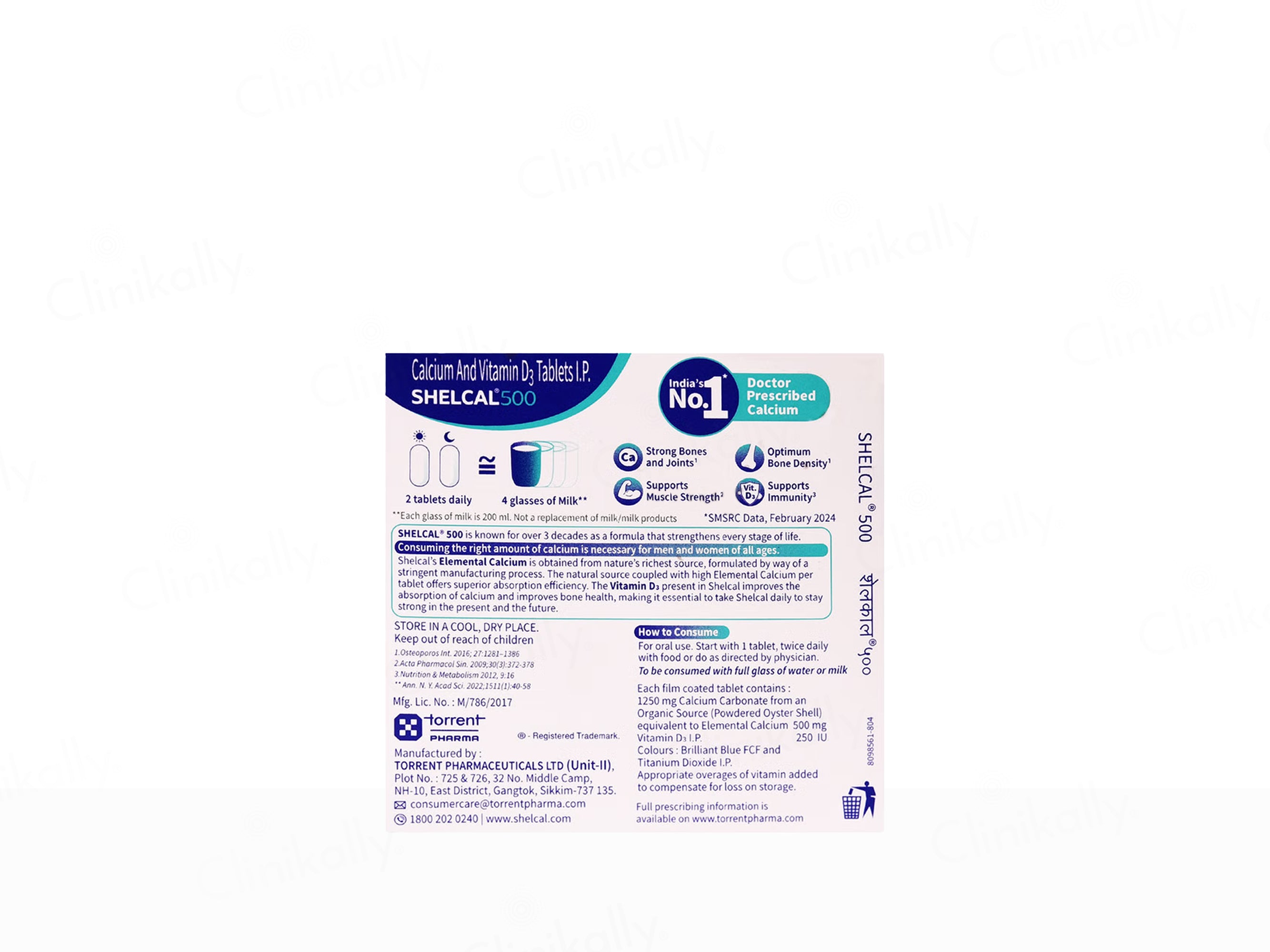 Each Shelcal 500 tablet contains 500 mg of elemental calcium from calcium carbonate.