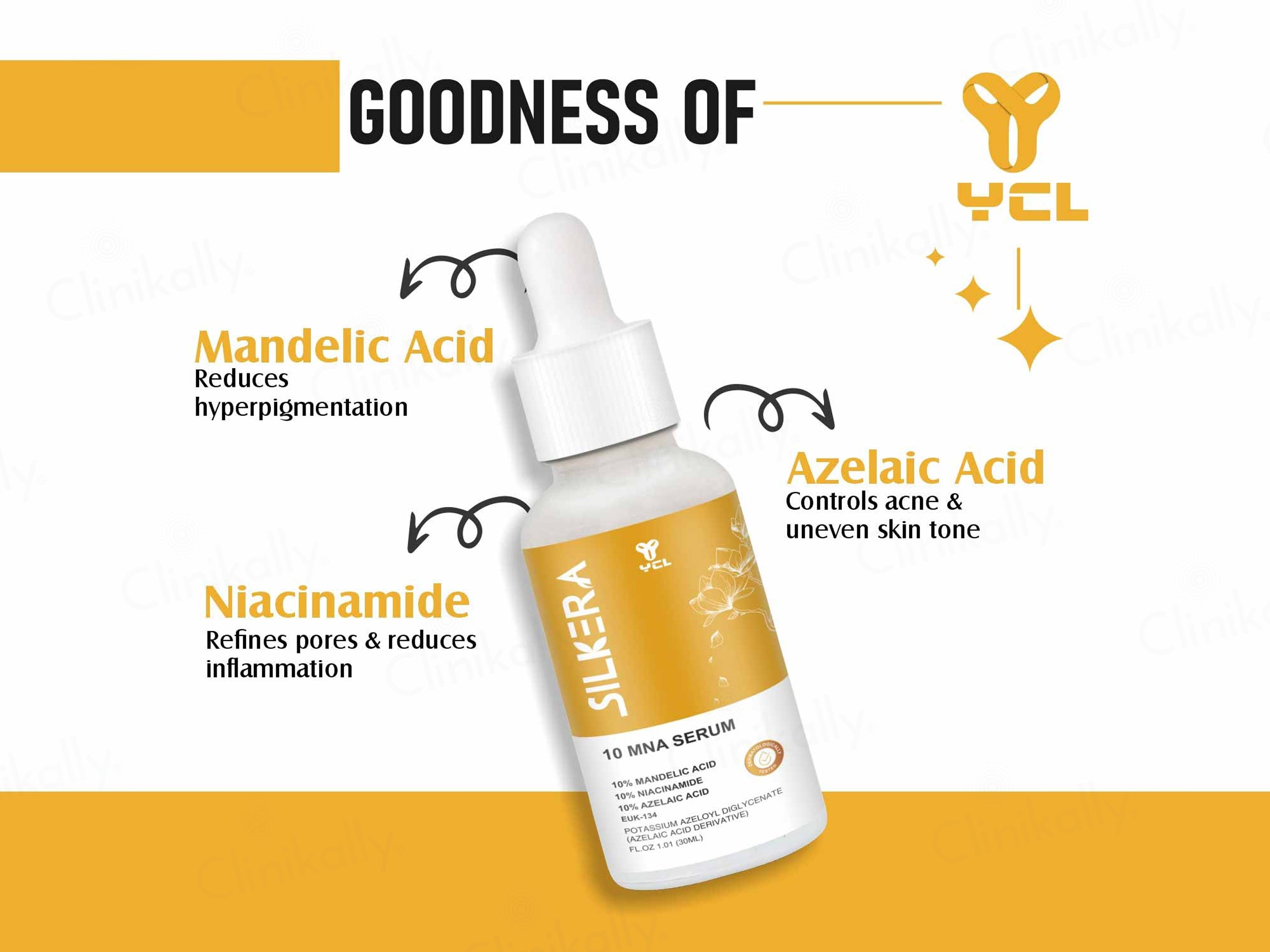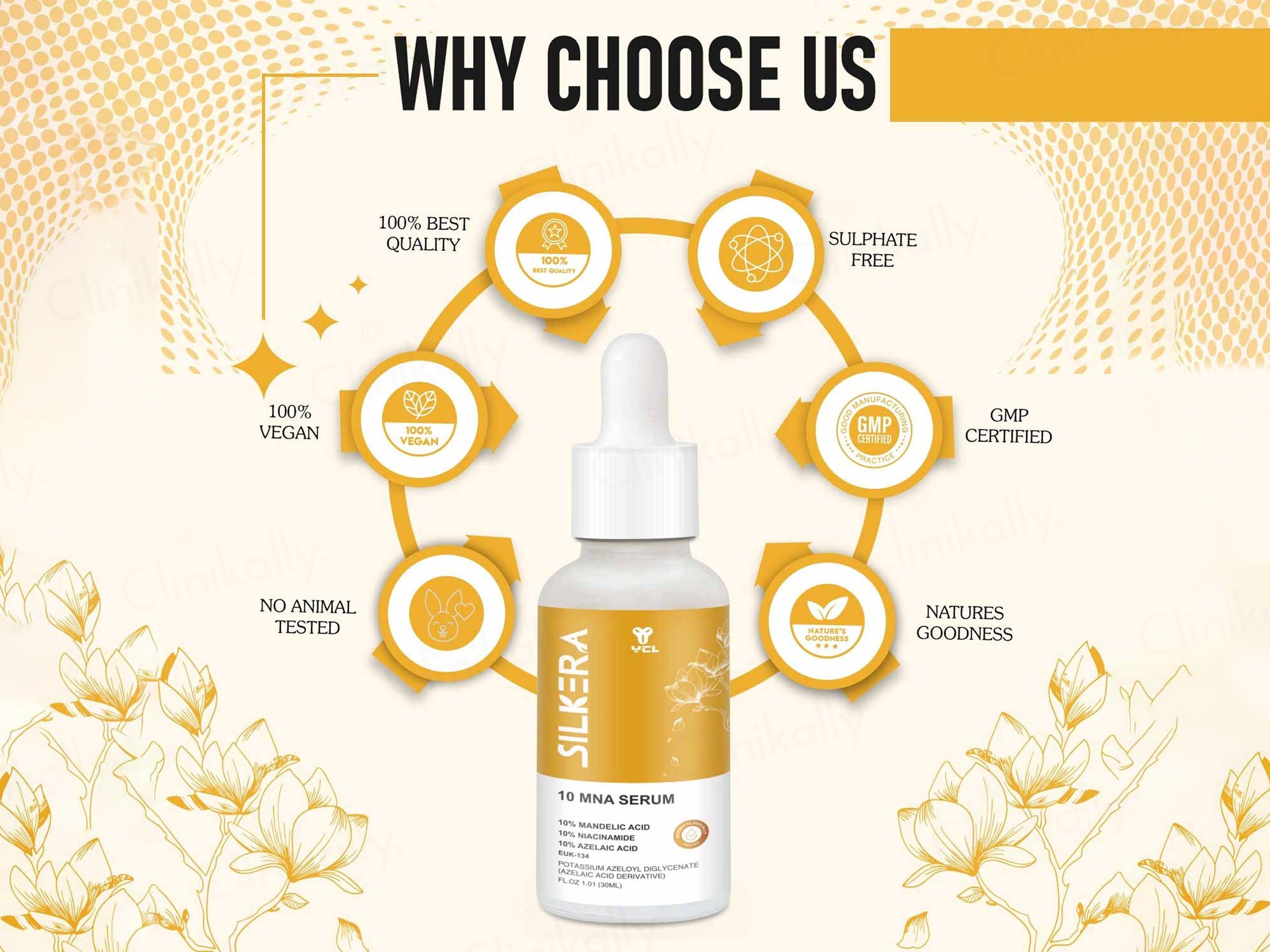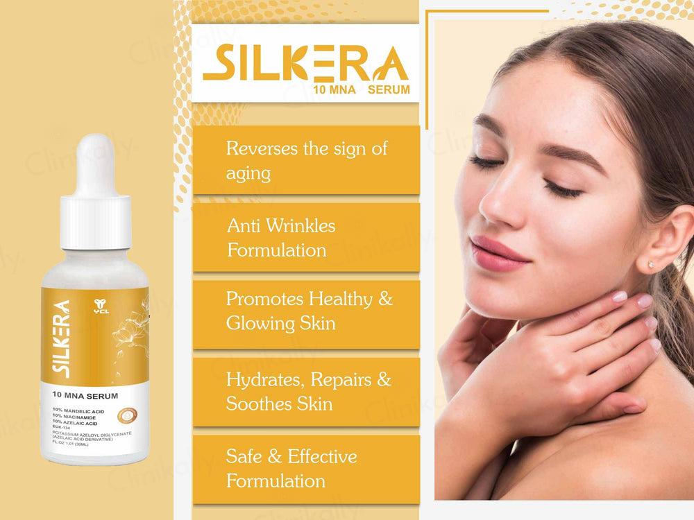 Silkera 10% MNA Serum is designed to reduce melasma, acne scars, and hyperpigmentation while promoting an even skin tone.