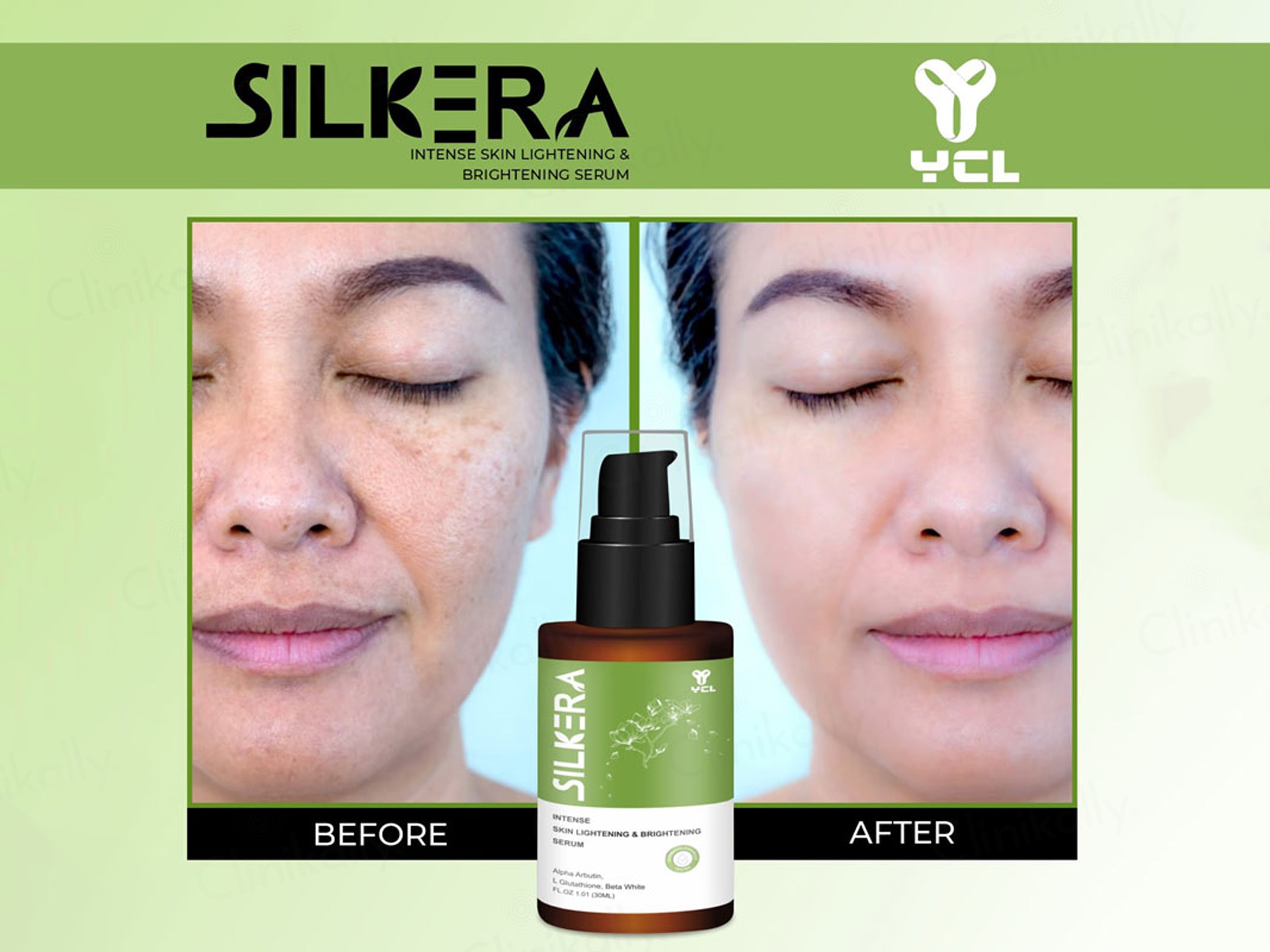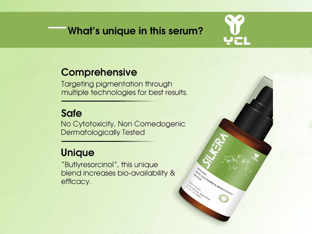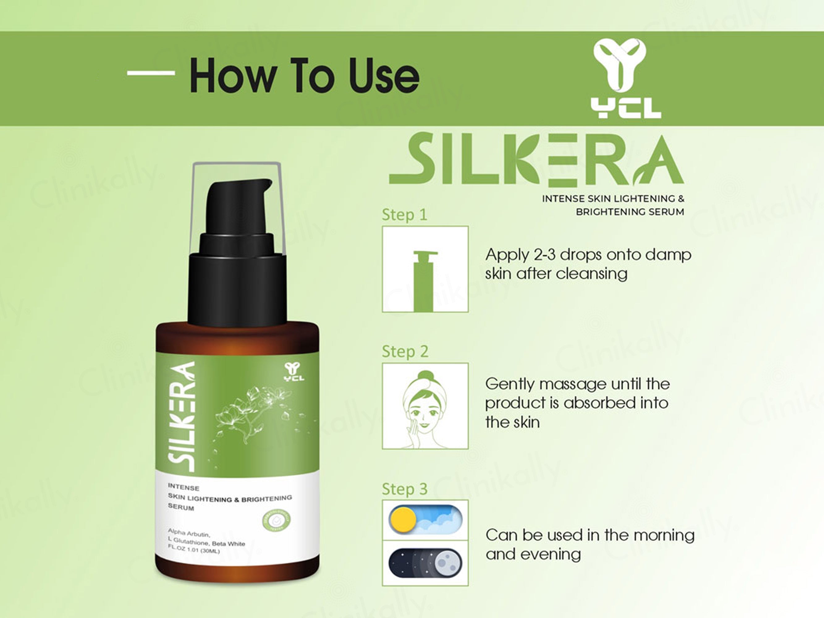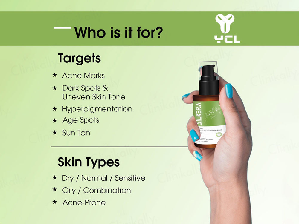 Silkera Skin Lightening & Brightening Serum helps reduce pigmentation, brighten the complexion, smoothen skin texture, and fade dark spots for an even skin tone.
