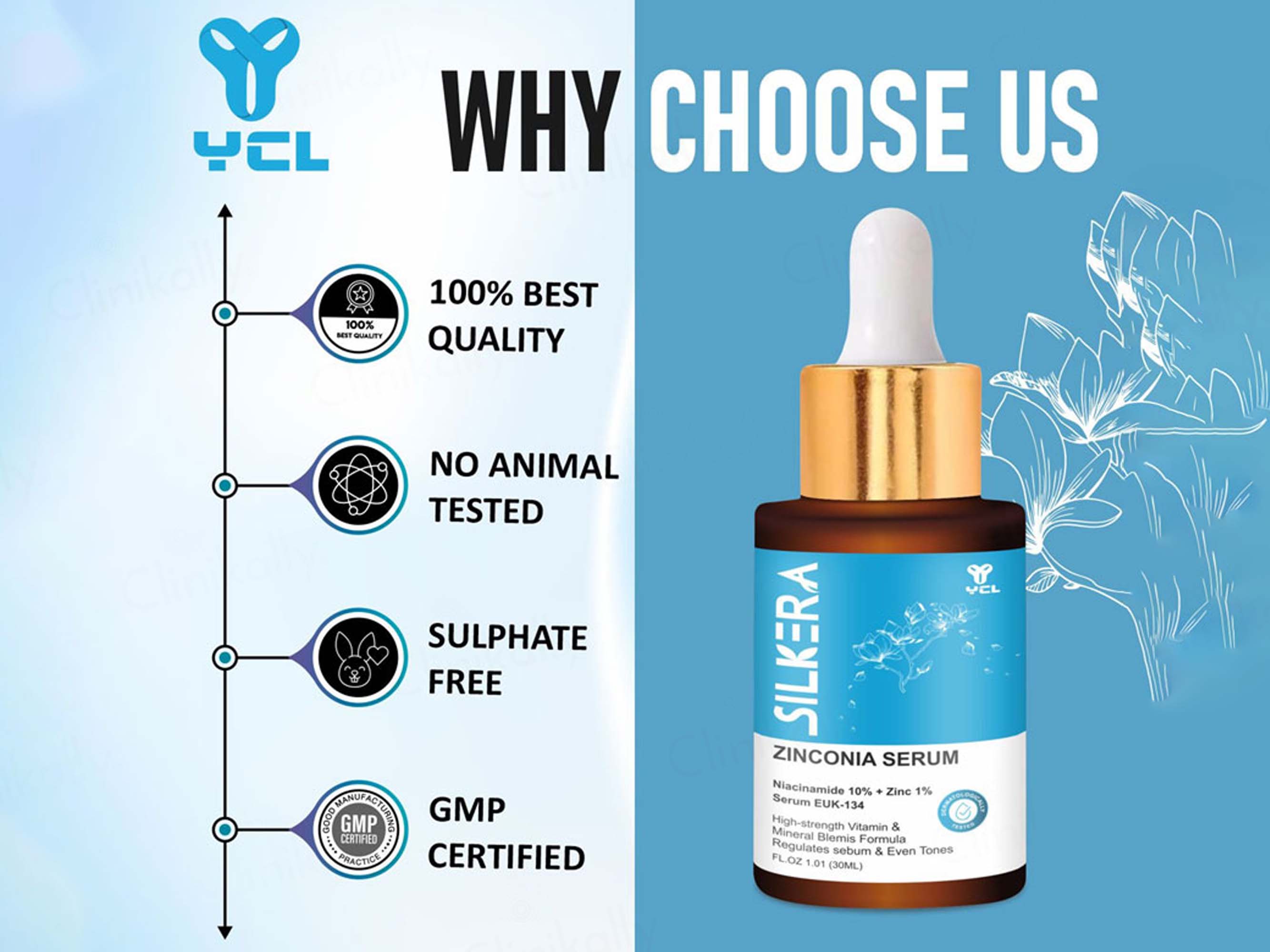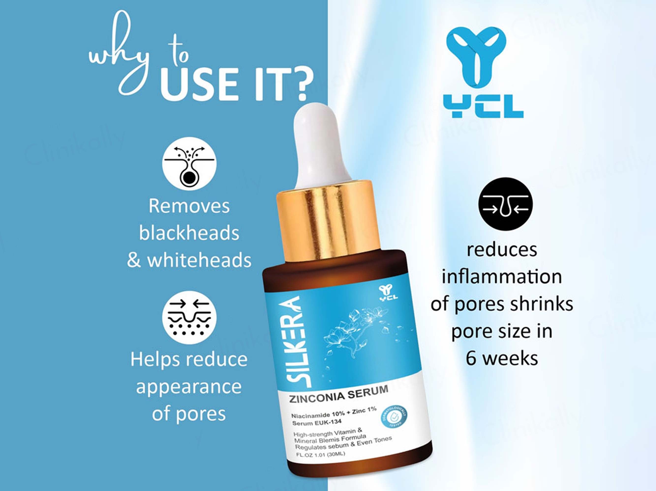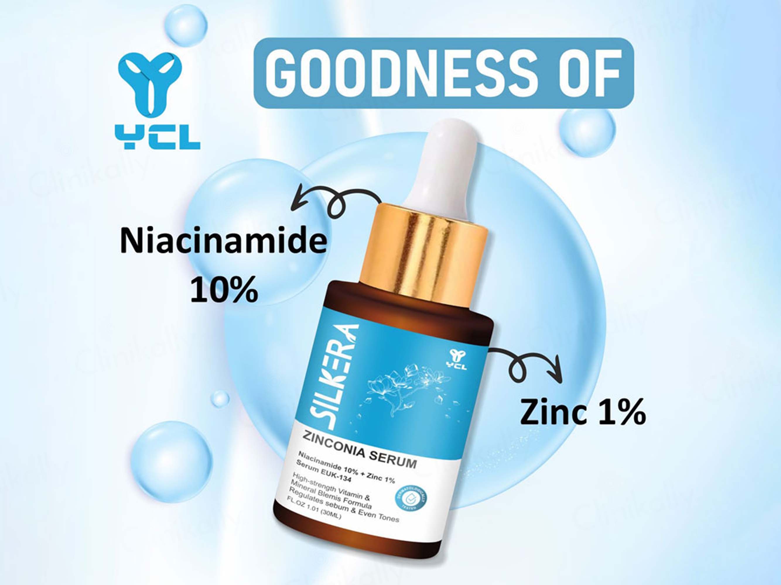 Silkera Zinia Face Serum contains Niacinamide (Vitamin B3), Zinc PCA, EUK-134, Matmarine, and Aloe Vera.