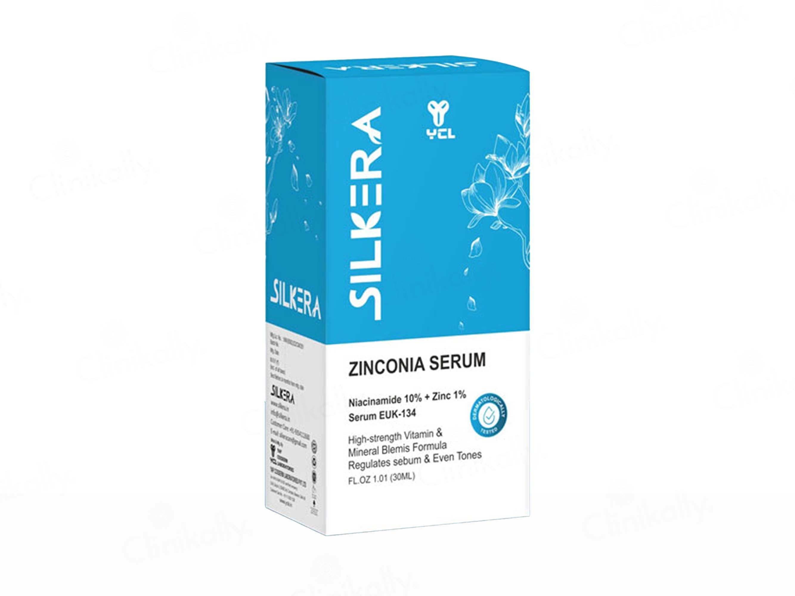 Silkera Zinia Face Serum is a high-strength vitamin & mineral blemish formula for oily and acne-prone skin; combining Niacinamide with Zinc PCA plus EUK-134 and Matmarine, it helps regulate excess sebum, reduce shine and visible pores, fade acne marks and redness, strengthen the skin barrier, and even skin tone; the quick-absorbing, non-greasy water-based serum can be used daily; pack size 30 mL.
