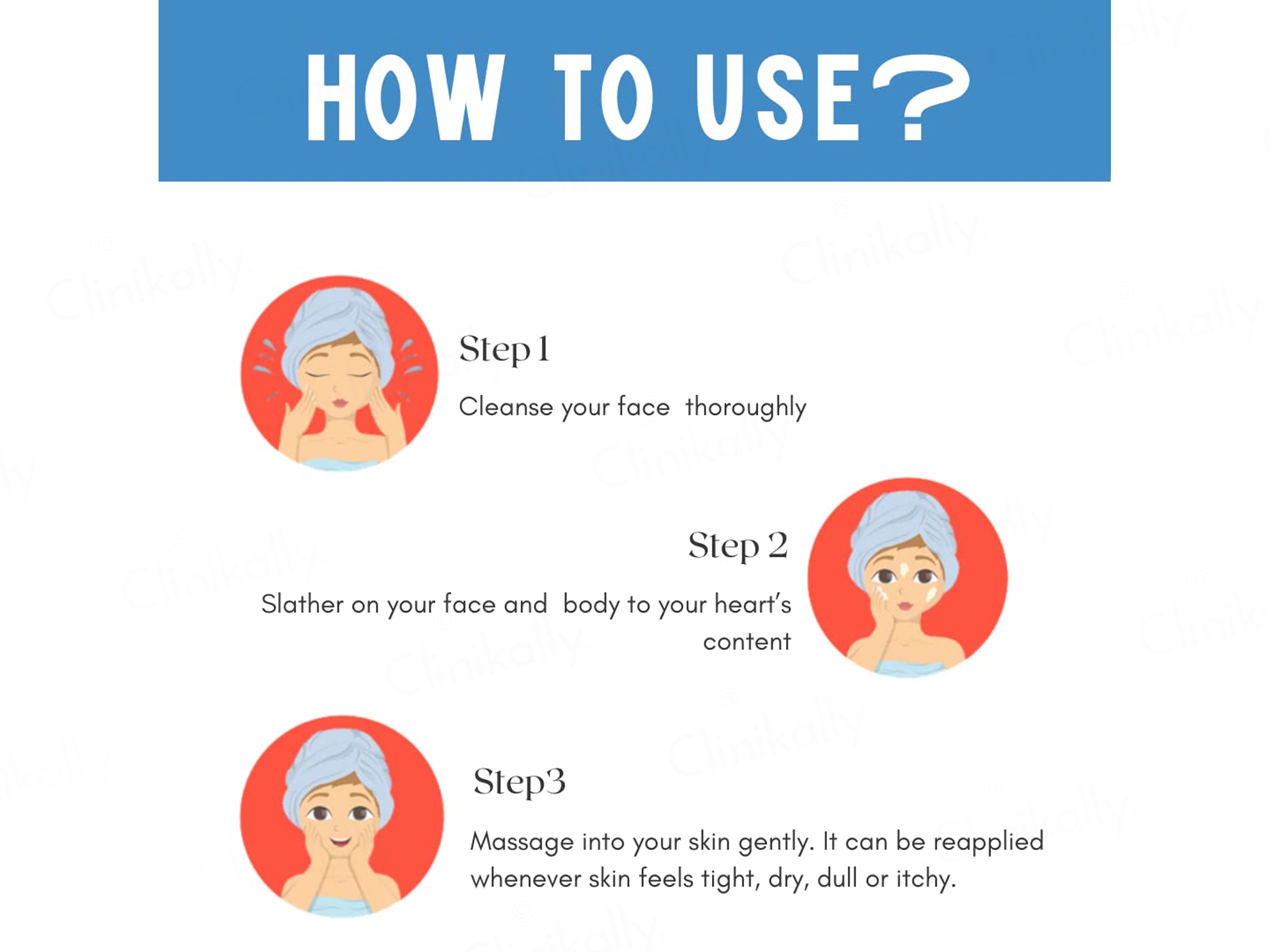 - Apply liberally on face and neck.