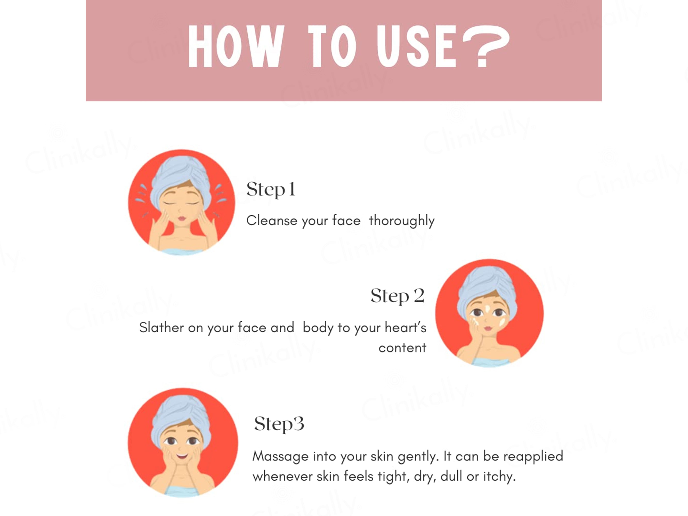 - Apply optimum quantity on face, neck, and body in upward circular motions for 2-3 minutes until absorbed; use daily for best results.