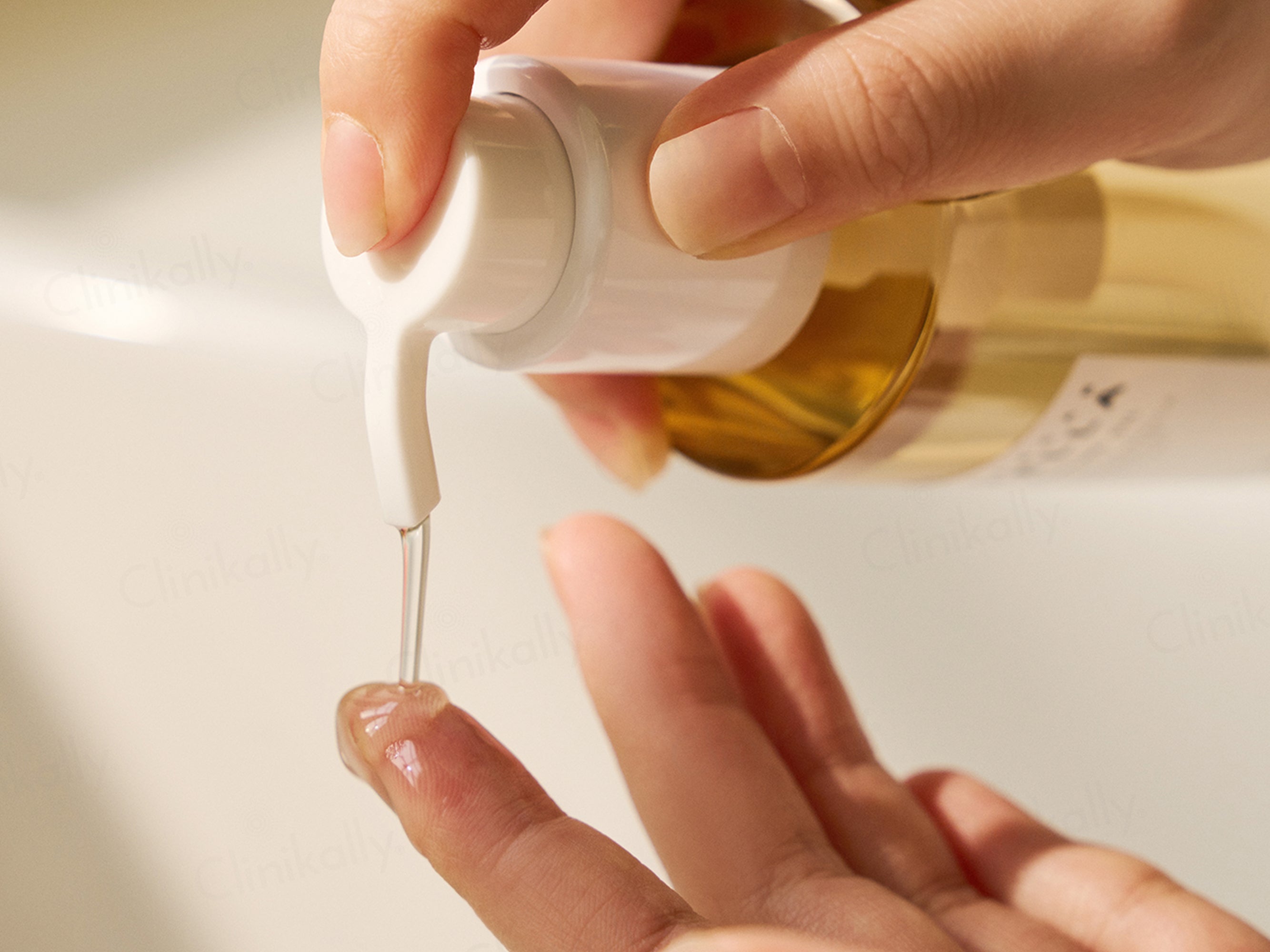 - Apply a few pumps of cleansing oil onto a dry face with dry hands.