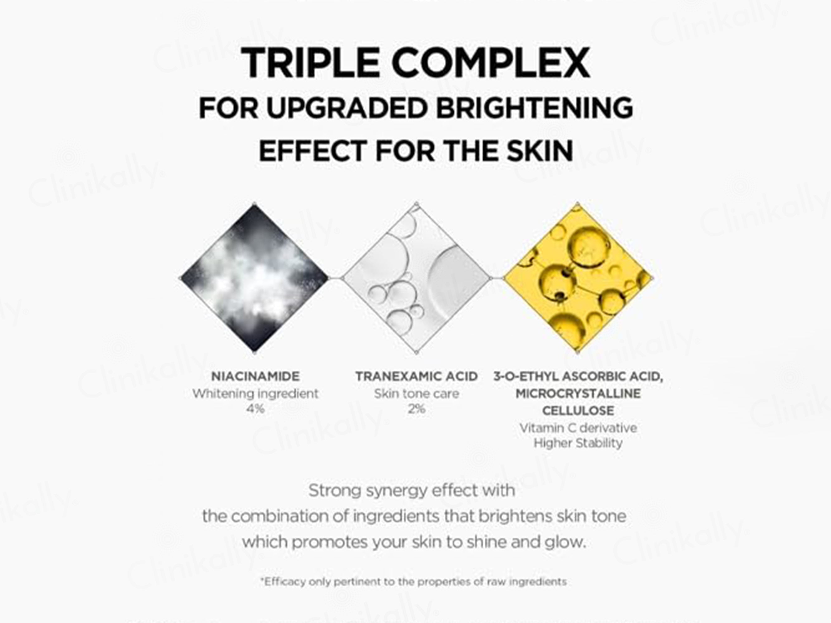 The key ingredients include Niacinamide, Tranexamic Acid, 3-O-Ethyl Ascorbic Acid, and Centella Asiatica Extract.
