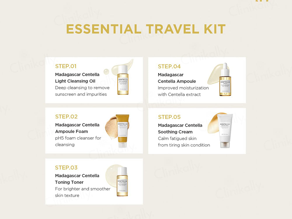 The SKIN1004 Madagascar Centella Travel Kit is a collection of five travel-size skincare products from the Madagascar Centella line that cleanses, tones, hydrates, and soothes the skin.