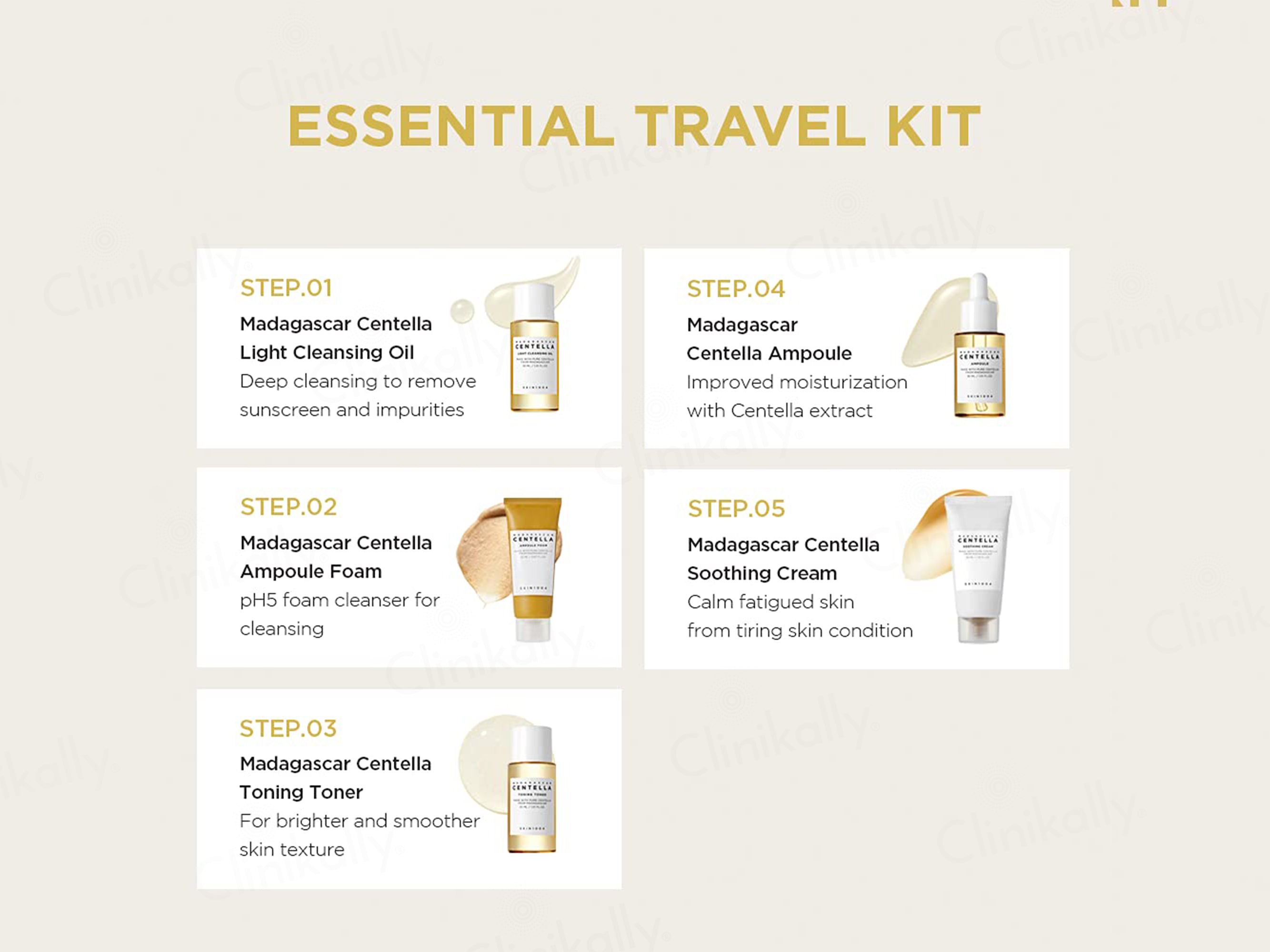 The SKIN1004 Madagascar Centella Travel Kit includes Centella Ampoule Foam, Centella Toning Toner, Centella Ampoule, Centella Soothing Cream, and Centella Light Cleansing Oil.