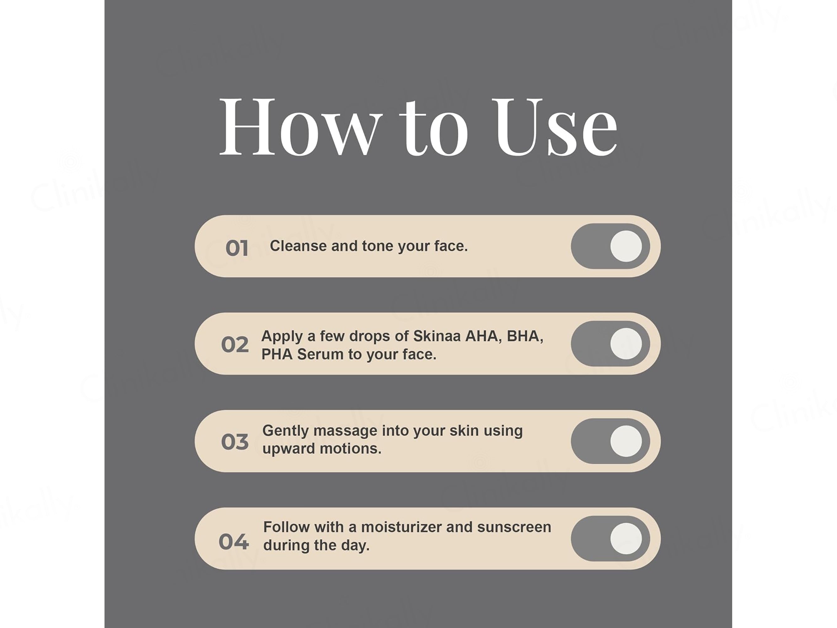 - Apply 3–4 drops of Skinaa AHA BHA PHA Face Serum on clean face and neck, avoid the eye area, gently massage in circular motions until absorbed, and use daily for best results.