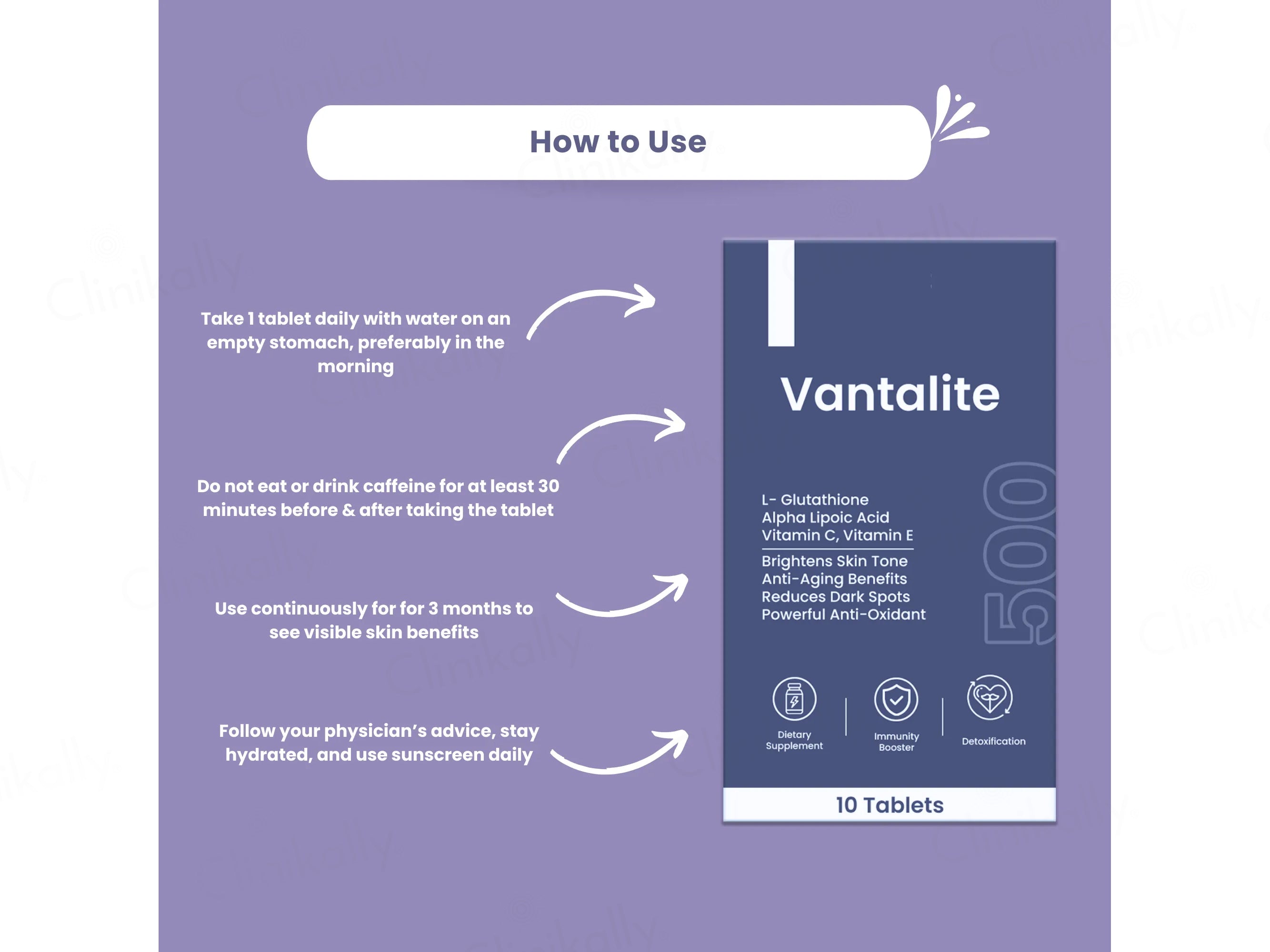 - Take Skinaa Vantalite-500 Skin Supplement Tablet as directed by the healthcare professional; do not exceed the recommended daily usage.