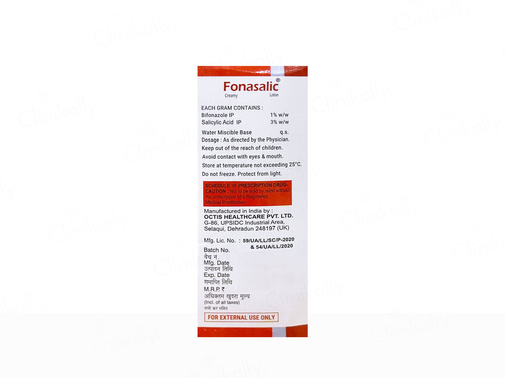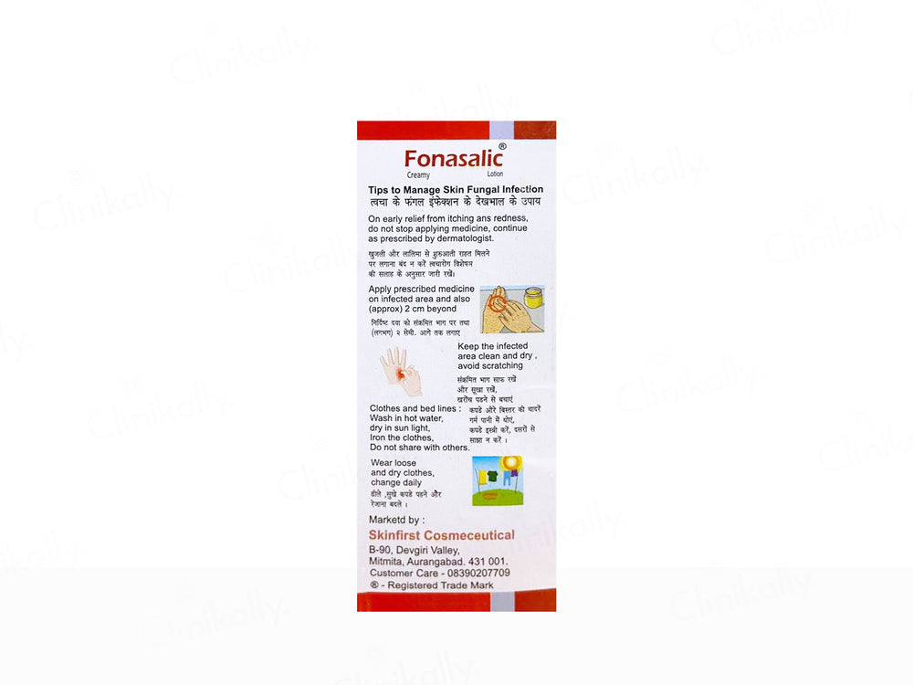 Skinfirst Fonasalic Creamy Lotion is a topical antifungal and keratolytic formulation that combines the powerful actions of bifonazole and salicylic acid to treat fungal infections of the skin with associated scaling, thickening, or flaking. Bifonazole targets the fungal cell membrane, halting fungal growth, while salicylic acid helps exfoliate and soften the affected skin layers, enhancing drug penetration. Ideal for conditions like athlete’s foot, ringworm, or jock itch, It effectively relieves itching, redness, and scaling, providing visible results with regular use.