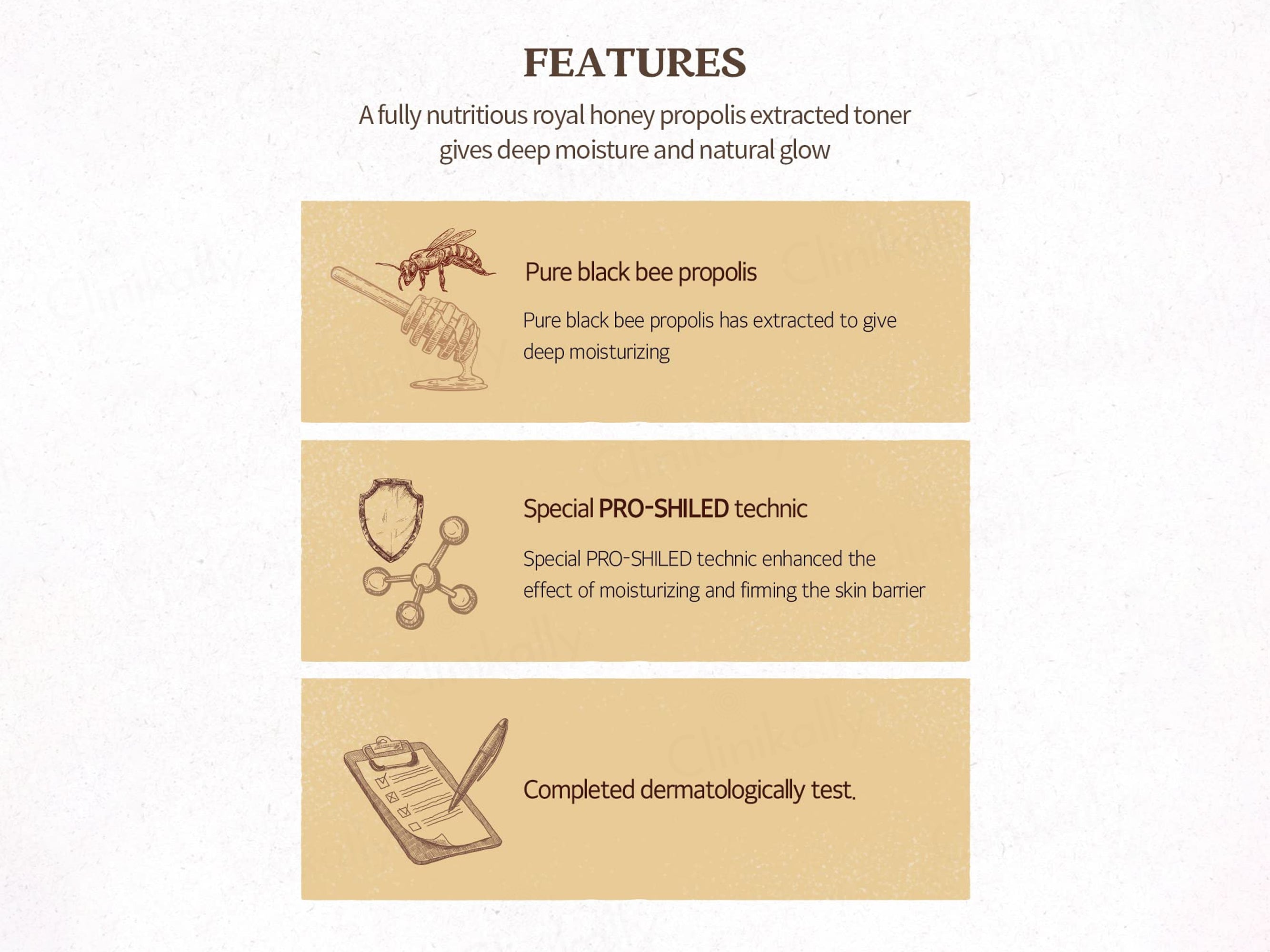 SKINFOOD Royal Honey Propolis Enrich Toner is a fully nutritious, milky-textured hydrating toner featuring 15% pure black bee propolis extract for deep moisture and natural glow, blended with royal jelly extract and honey extract to nourish, soothe, and strengthen the skin barrier against environmental damage, enhanced by special PRO-SHIELD technology that ferments propolis for optimal absorption and firming effects, dermatologically tested for all skin types. Enriched with key ingredients like Lactobacillus Ferment, Saccharomyces Ferment, Citrus Tangerina Peel Oil, Boswellia Carterii Oil, Cananga Odorata Flower Oil, and Glycerin for antioxidant protection, anti-inflammatory relief, and balanced hydration, this lightweight formula preps the skin by layering moisture without greasiness, making it ideal for dry or dull complexions in a K-beauty routine to promote supple, radiant, and resilient skin with consistent use after cleansing.