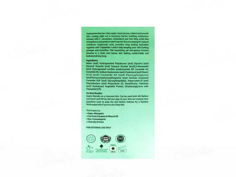 Skinmedis Hydraprime Barrier+ Skin Repair Cream is a dermatologist-recommended moisturizer designed to repair, protect, and deeply hydrate the skin. Formulated with a powerful 5X Ceramide Complex, Cholesterol, Free Fatty Acids, and Hyaluronic Acid, it strengthens the skin's natural barrier, enhances moisture retention, and restores suppleness. Infused with Tripeptide-1, it visibly plumps and smooths the skin, promoting long-lasting hydration and resilience. The lightweight, non-greasy texture absorbs quickly, making it ideal for daily use on dry, compromised, or sensitive skin. Experience visibly healthier, radiant, and soothed skin all day long.