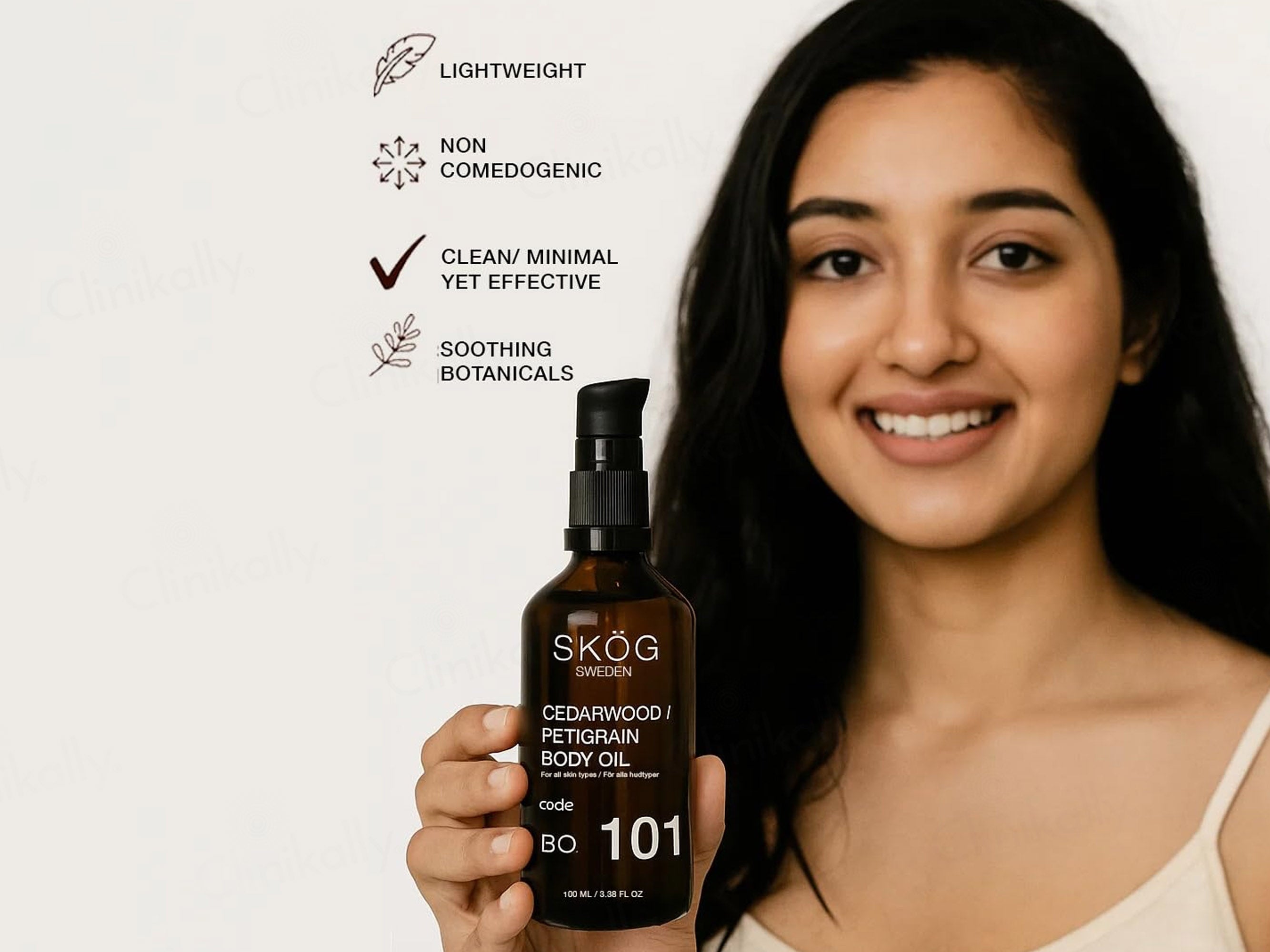 SKOG BO Cedarwood & Petitgrain Body Oil is a lightweight bath oil perfect for daily use, ideal for dry, dull skin, body marks, spots, body acne, and dark elbows and knees, providing 24-hour moisturization with easy absorption. This 100ml oil, featuring a soothing unique fragrance that transfers you to a luxury spa instantly, is formulated with key ingredients like Cedarwood Oil, Petitgrain Oil, Argan Oil, Olive Oil, Jojoba Oil, Castor Oil, Almond Oil, Sesame Oil, Birch Oil, Rosemary Oil, Safflower Oil, Glyceryl Caprylate, and Glyceryl Undecylenate, which work together to nourish, treat pigmentation, and prevent skin infections while being suitable for all skin types.