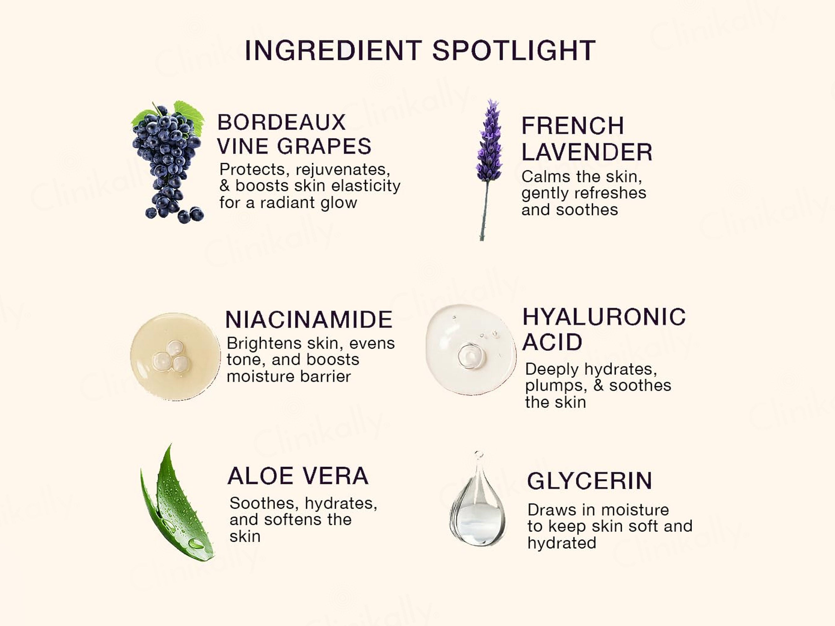It gently cleanses without drying, hydrates with hyaluronic acid, evens skin tone with niacinamide, soothes with lavender, and rejuvenates skin naturally.
