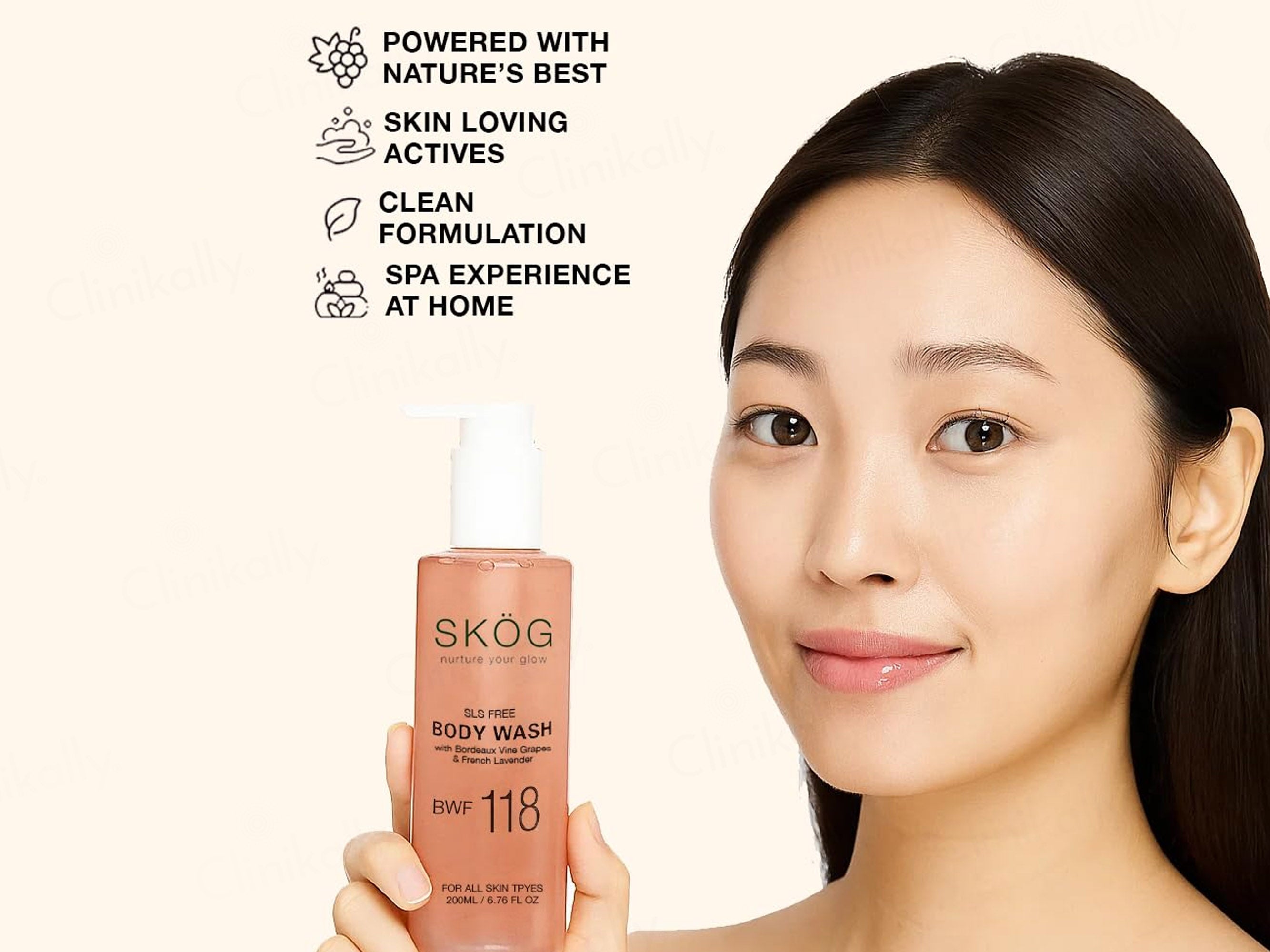 SKOG BWF SLS Free Body Wash is an SLS-free cleansing gel designed for all skin types, effectively cleansing the skin gently without drying it out, thanks to its carefully formulated blend with a subtle, calming fragrance. Enriched with key ingredients like Aqua, Disodium EDTA, Peg 150 Distearate, Sodiul Lauryl Sarcosinate, Niacinamide, Decyl Glucoside, Coco Glucoside, Cocamidopropyl Betaine, Glycerin, Aloe Vera Extract, Iscaguard Pef, Lavender Extract, Pentavitin, Fragrance (IFRA certified), and Bordeaux Vine Grape Extract, it provides nourishing hydration with hyaluronic acid and aloe vera, leaving the skin soft and thoroughly moisturized, while promoting even skin tone, soothing aromatherapy, antioxidant benefits, and skin rejuvenation.