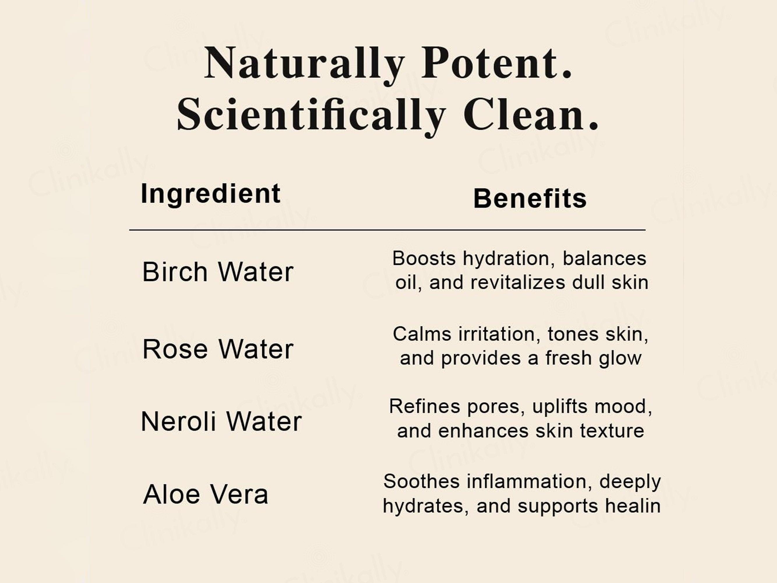 SKOG FT Birch Sap Facial Tonic Mist is an alcohol-free toner crafted for daily use across all skin types, including oily, acne-prone, combination, normal, and sensitive skin, designed to hydrate, balance pH levels, tighten pores, and remove dirt, makeup, and grime with a refreshing mist effect. Enriched with Birch Sap, a natural elixir rich in vitamins A, C, E, B complex, minerals like potassium, calcium, magnesium, zinc, and iron, plus amino acids, betulinic, and organic acids, it features key ingredients like Birch Sap, Rose Hydrosol, Neroli Hydrosol, Witch Hazel Hydrosol, Aloe Vera Aqueous Extract, Grape Seed Oil, Glyceryl Caprylate, and Glyceryl Undecylenate, which soothe, hydrate, and leave the skin ready for moisturizer or serum application.
