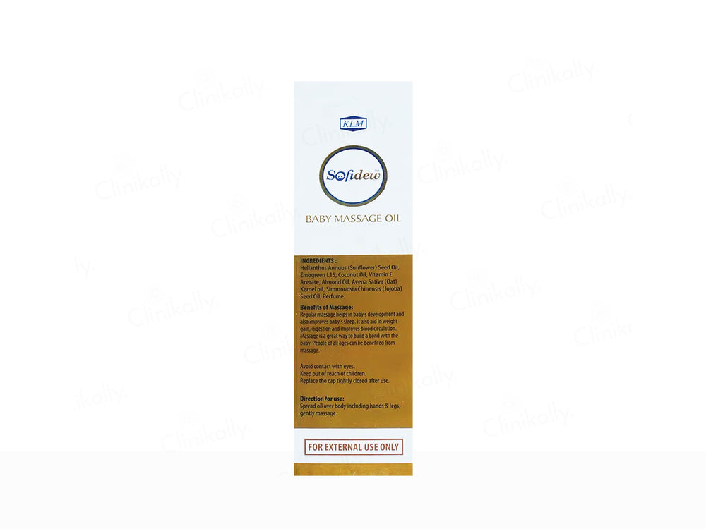Sofidew Baby Massage Oil is a nourishing blend designed to moisturize and soothe your baby's delicate skin. Enriched with natural oils like almond, coconut, and jojoba, this oil provides essential nutrients and hydration. Its lightweight, non-greasy formula absorbs quickly, leaving the skin soft and supple without clogging pores. Hypoallergenic and free from harmful chemicals, Sofidew Baby Massage Oil is perfect for daily use, promoting relaxation and enhancing the bonding experience during massage.