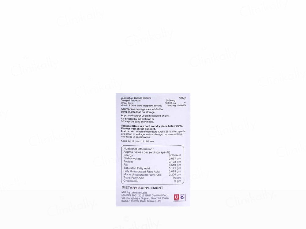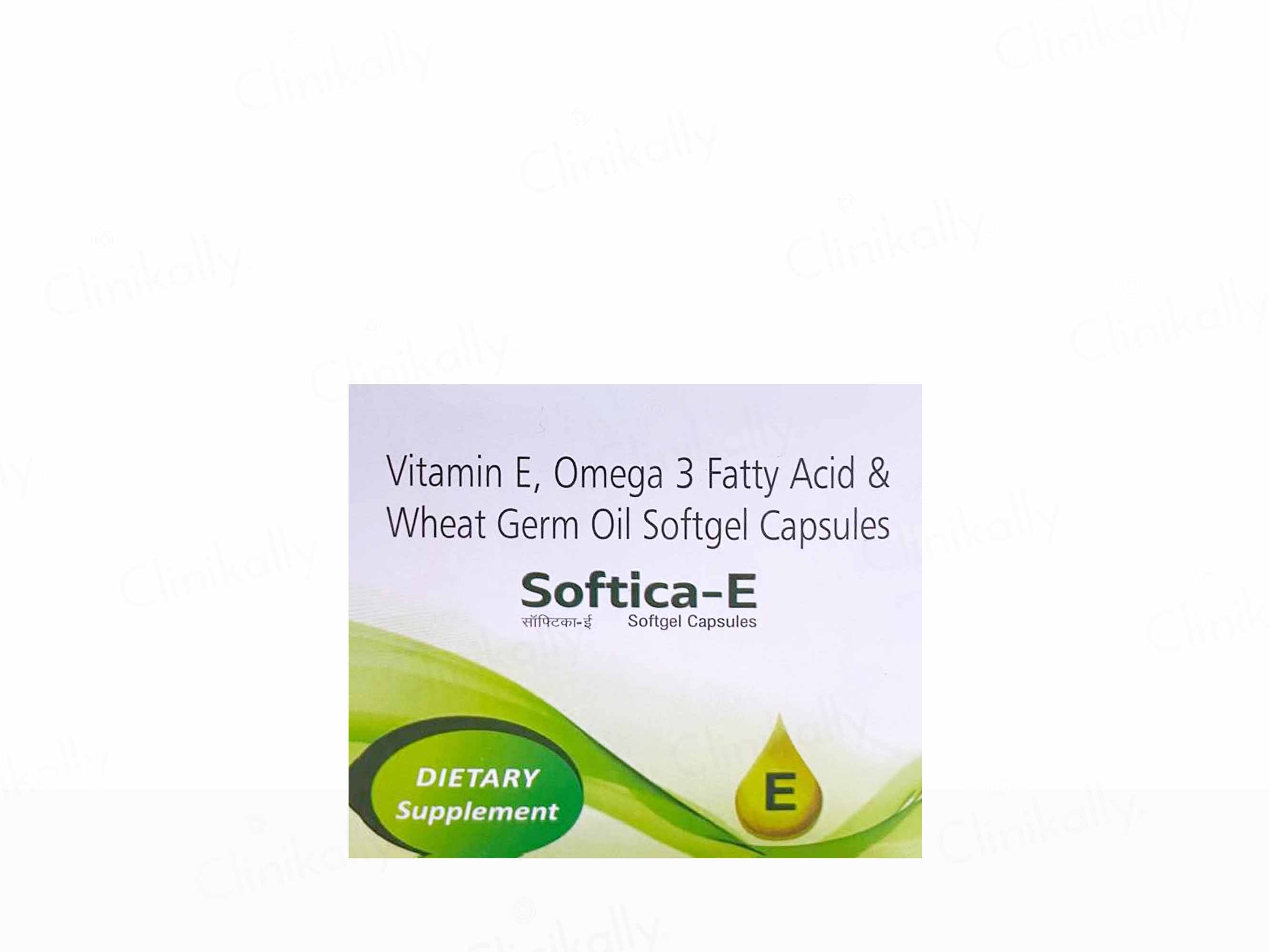 Softica-E Softgel Capsule contains Vitamin E, Omega-3 Fatty Acids, and Wheat Germ Oil to support overall health.